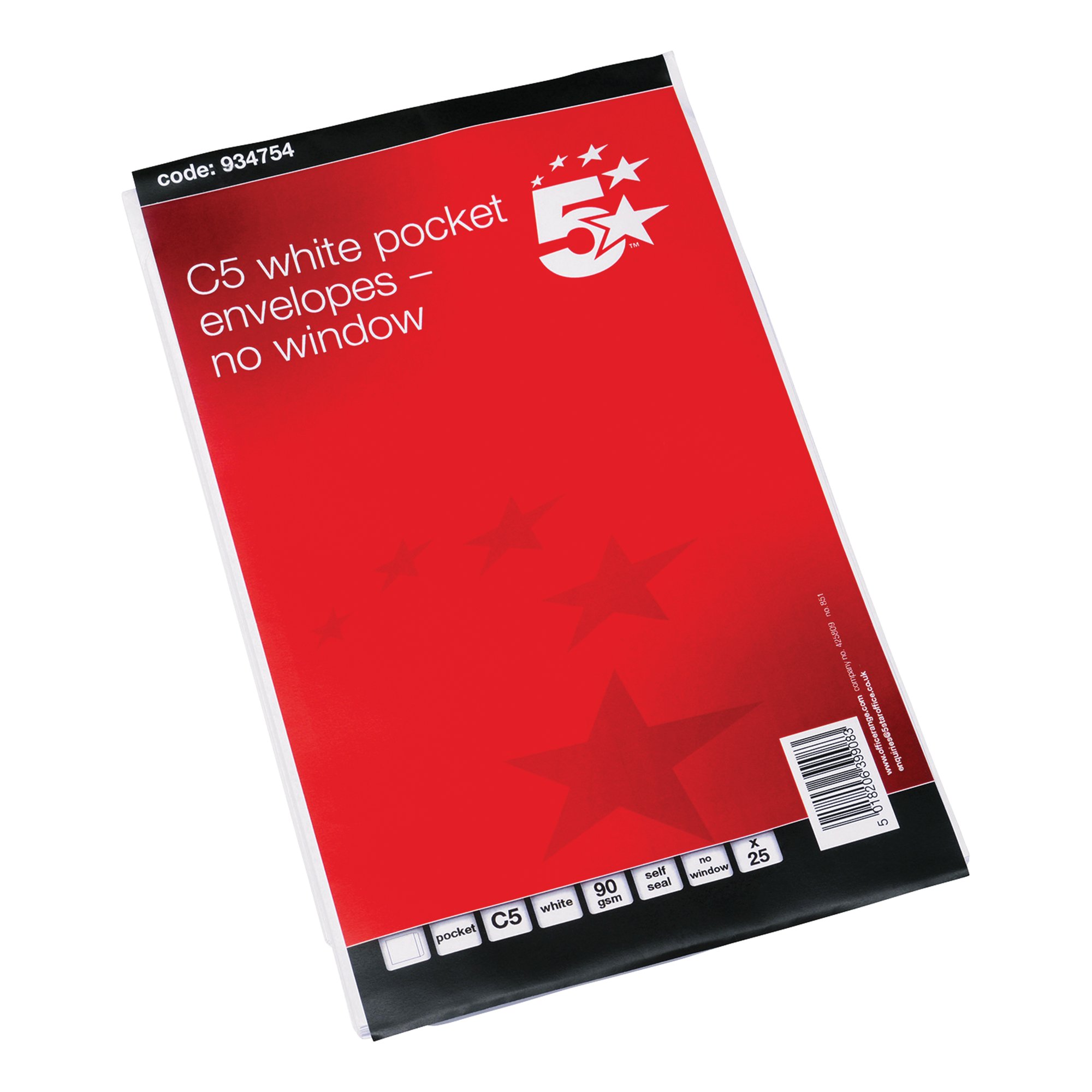 5 Star Office Envelopes Pocket Self Seal 90gsm C5 229x162mm White Retail Pack (Pack of 25)