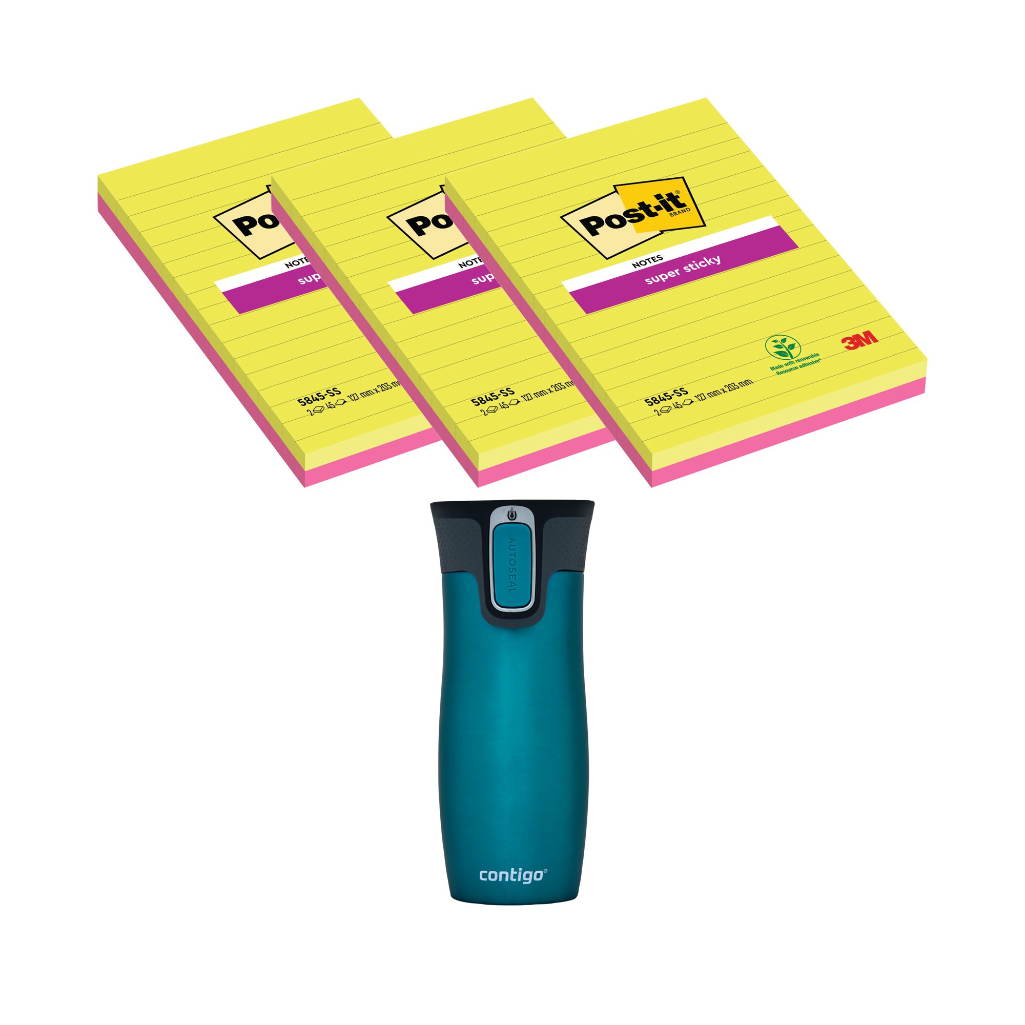 Post-It Super Sticky 101 x 152mm Lined Ultra (3 packs of 3 Pads) + FOC Contigo Travel Mug