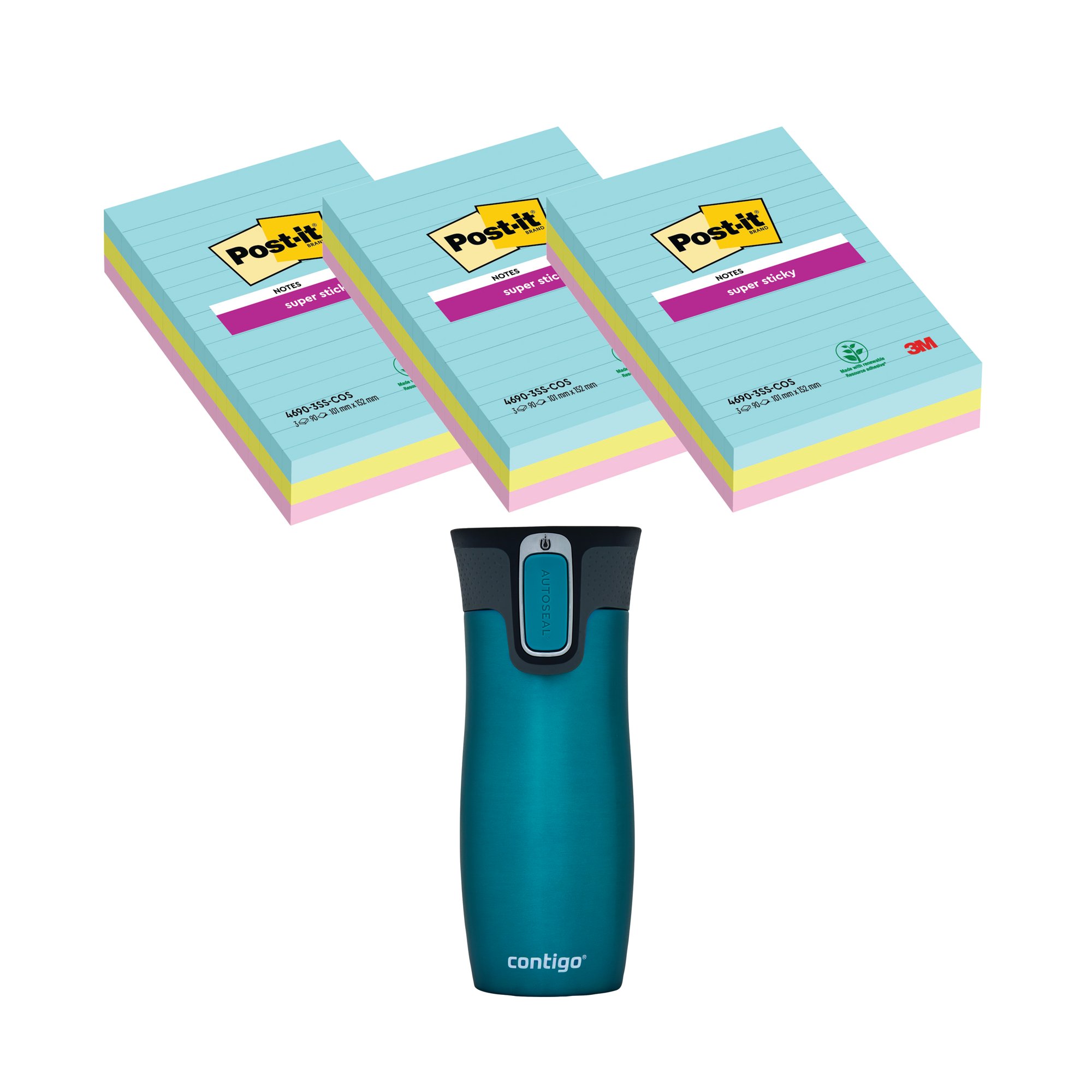 Ideal for desktop use, these XXL repositionable Post-it Notes feature Super Sticky adhesive for a stronger, longer hold, which is perfect for important notes, messages and reminders. Each pad contains 90 sheets and measures 101 x 152mm. This promotional pack contains 3 Packs of 3 lined pads in assorted Cosmic colours plus a FREE Contigo Travel Mug.