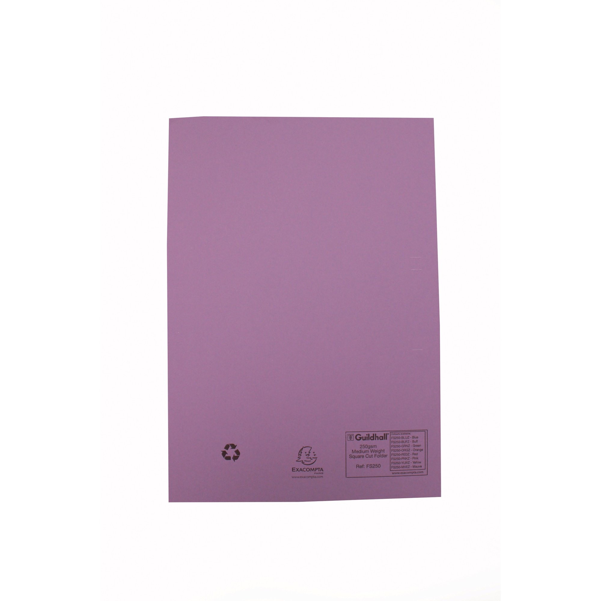 These environmentally friendly Guildhall square cut folders are made from 100% recycled, mediumweight 250gsm manilla. Suitable for filing both A4 and foolscap documents, each folder can hold up to 100 sheets of 80gsm paper. This pack contains 100 mauve folders.
