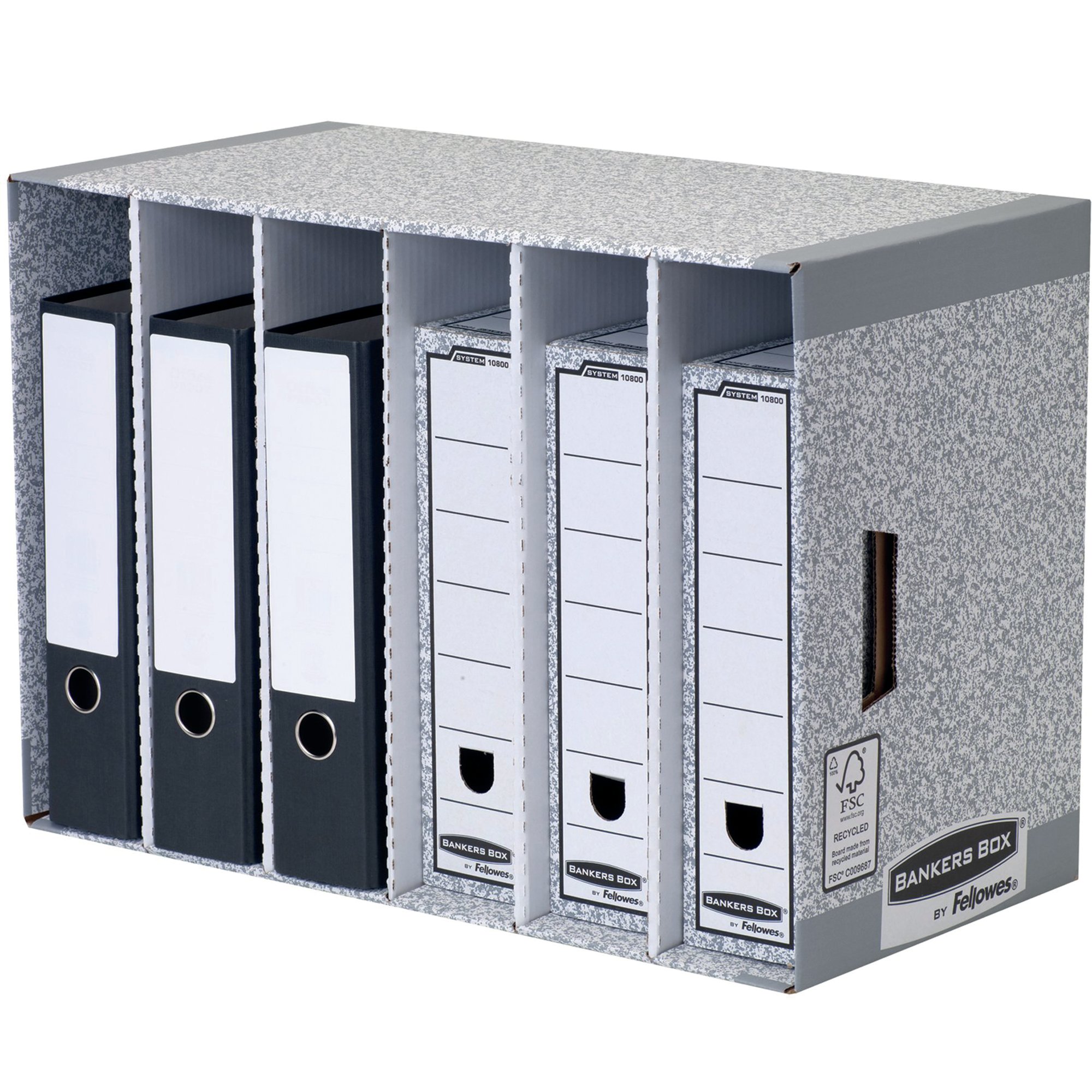 This desktop Bankers Box file store module contains 6 compartments to store 80mm Bankers box transfer files, lever arch files and ring binders. The unit features time saving FastFold assembly and is stackable up to 3 high. This desktop module measures W580 x D290 x H400mm (external).