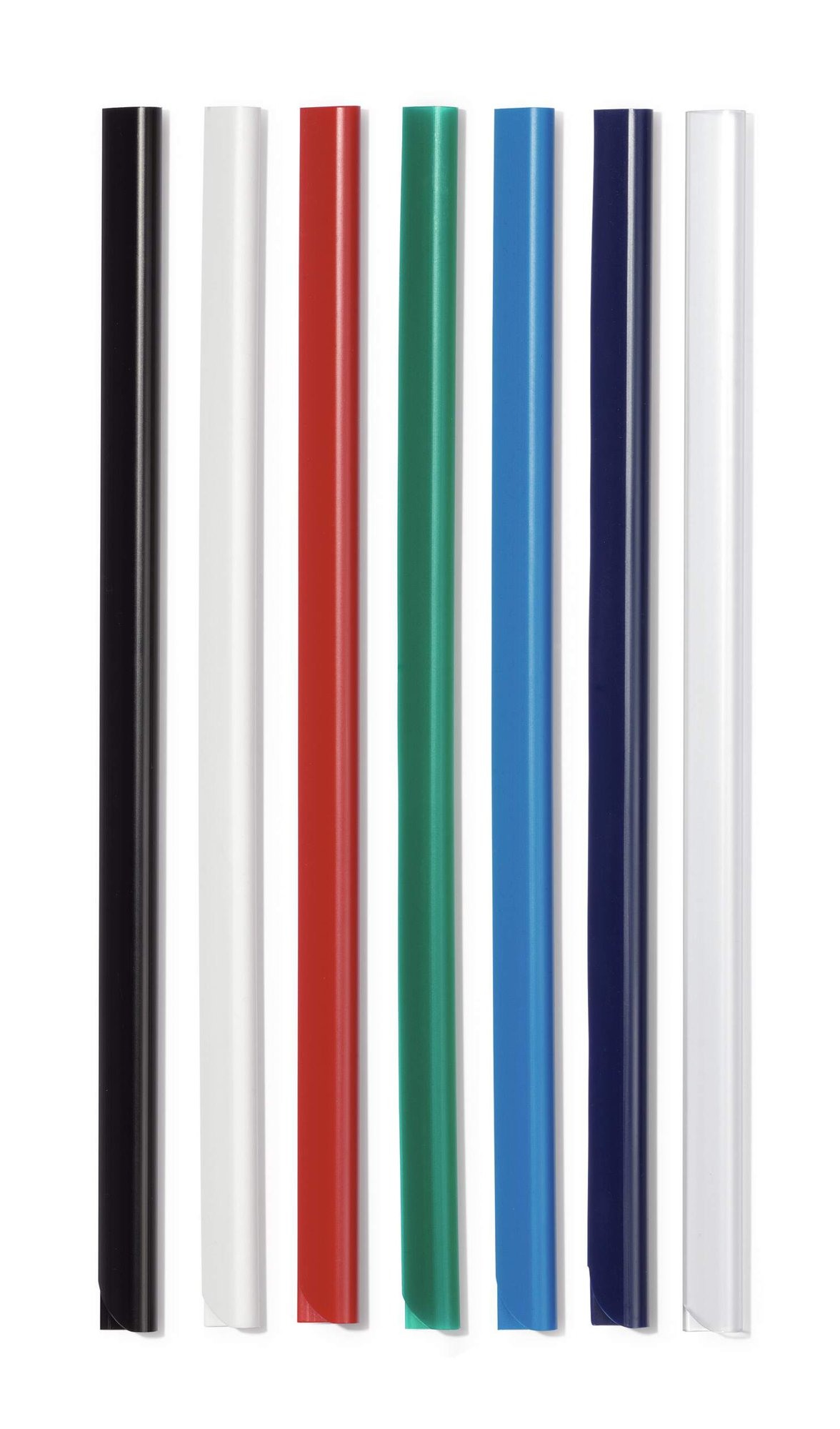 Durable Spine Bar, these plastic spine bars are a versatile binding system for unpunched papers and documents in seconds. The unique contoured ends provide simple and easy insertion of all papers. The spine bar is 6mm in thickness meaning it can hold up to 60 sheets of A4 paper. Supplied in pack of 50 black spine bars.