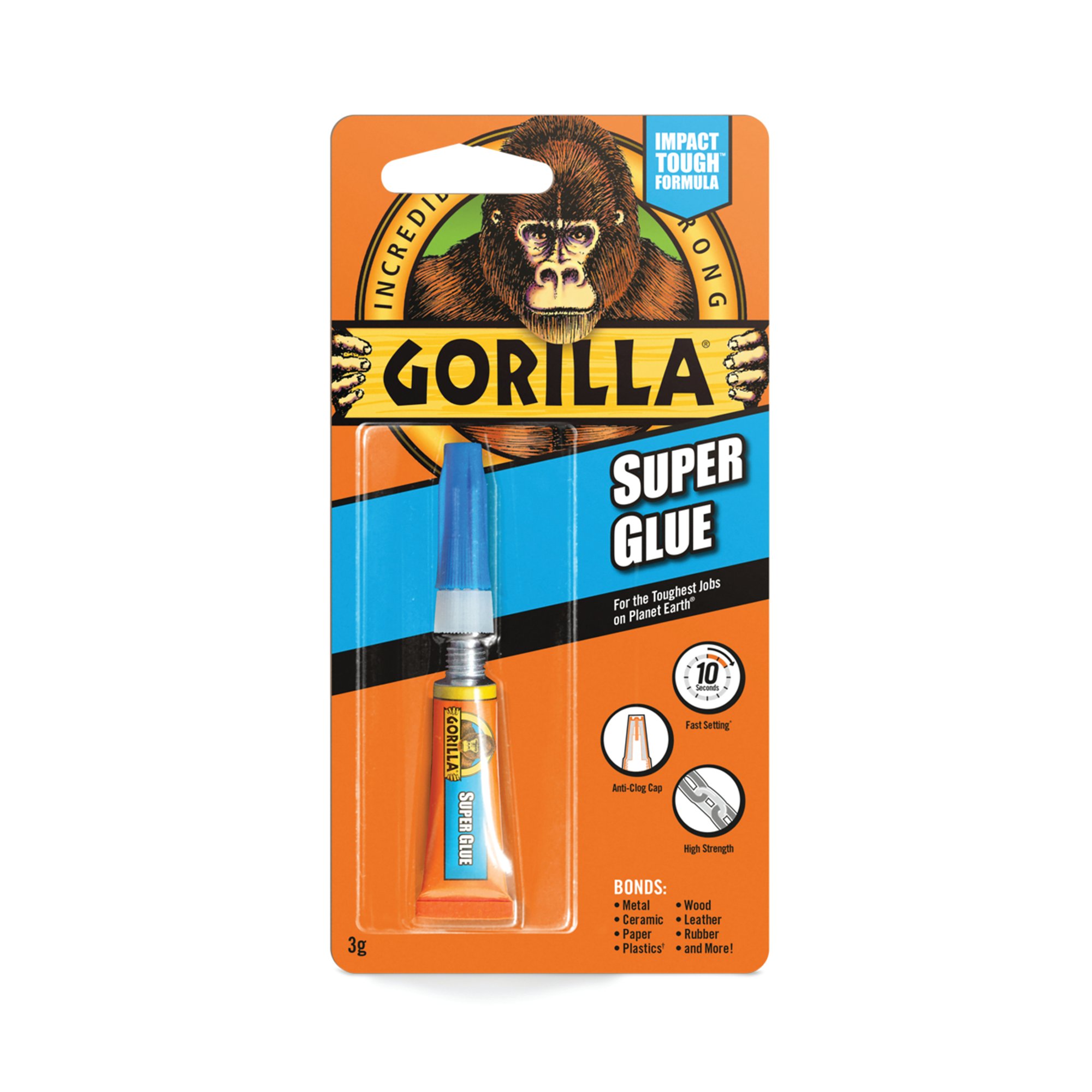 Gorilla Super Glue is Impact-Tough, meaning it is formulated for increased impact resistance to handle wear and tear. An anti-clog cap with a metal pin inside ensures an airtight seal for maximum reusability. , Drying in 10-45 seconds with no gripping required, this fast setting glue is supplied in a pack of 10.