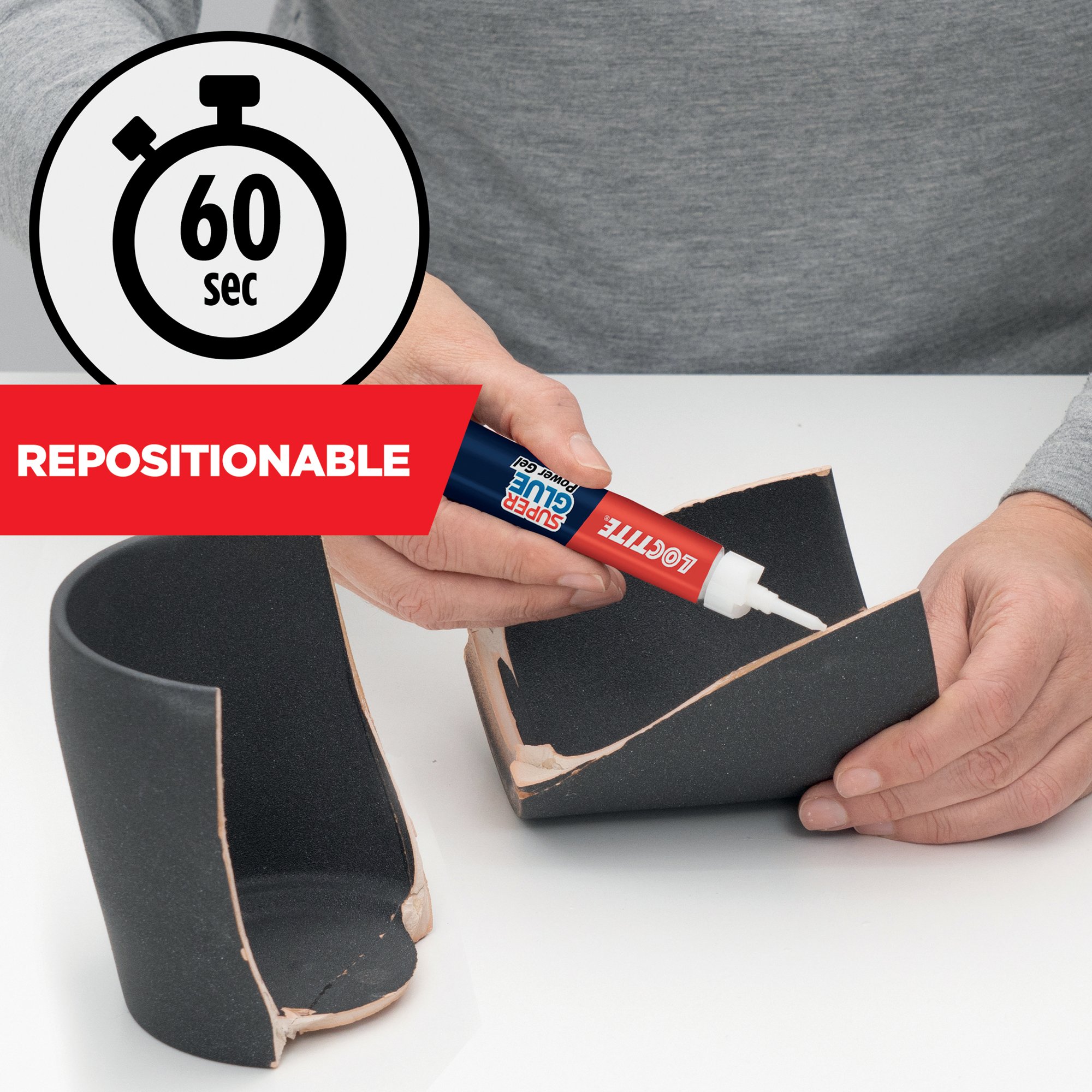 Formulated with cyanoacrylate rubber-infused gel formula, this Loctite Super Glue Power Gel allows powerful bonds that are extremely precise even on vertical surfaces and materials that require high flexibility. Ideal for repairs at home, being repositionable for up to 60 seconds, it will repair larger surfaces without clamping. This works on a variety of materials from wood, rubber, plastic and more, including leather. Withstanding strong conditions and shock resistant, it serves as a waterproof glue and a heatproof glue. Supplied in a 20g tube.