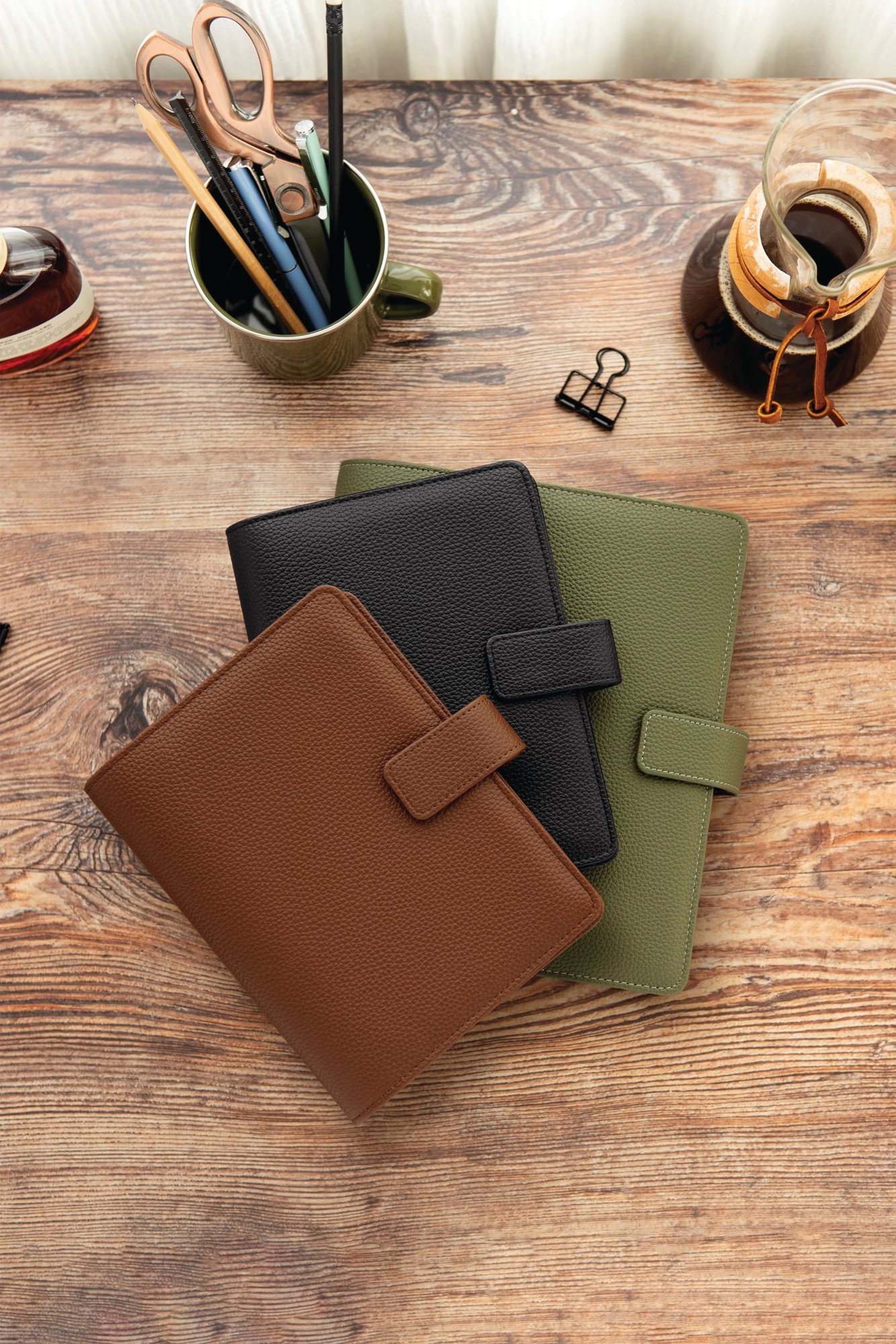 A gender-neutral organiser created with sustainability and lifestyle organisation in mind. Crafted from vegan grain leather made from 100% post-consumer recycled plastic and featuring 100% recycled, fountain pen friendly paper, this collection offers a stylish yet conscious choice. With the innovative feature of charcoal removable rings, the Camden redefines flexibility and functionality, making it easier than ever to customise any planning experience. Supplied in Mocha.