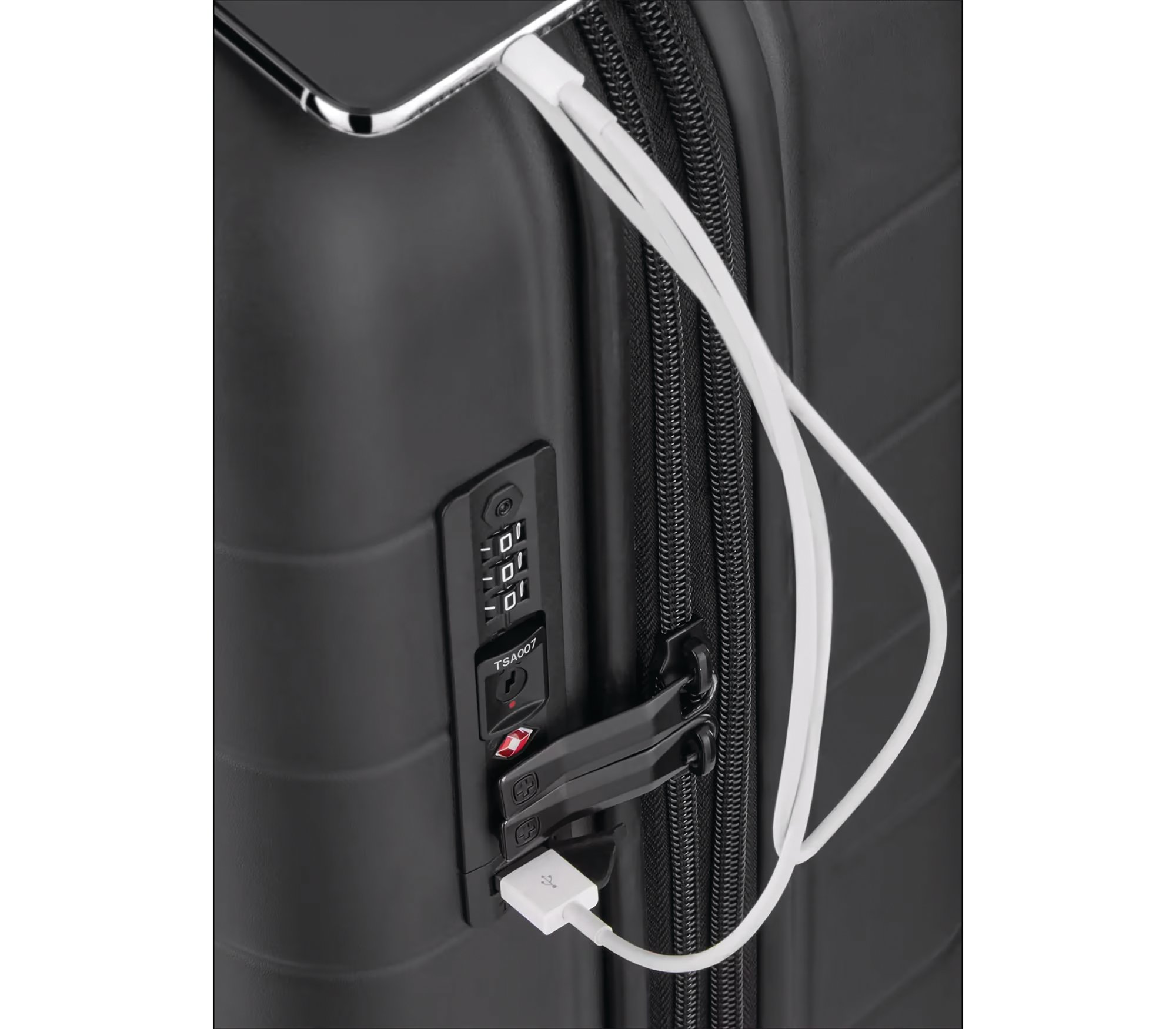 Robust yet perfectly portable, the Syntry Carry-On is a powerhouse rolling case with precision manoeuvrability. The compression moulded front compartment safely stores your 14' laptop and 10' tablet, while the quick pocket offers speedy access to important items. Spacious and secure thanks to the combination lock and security zipper, there's also a USB charger and integral ID tray. Four super quiet dual-caster wheels make for easy wheeling, so you can sail across the terminal or cruise along the platform.