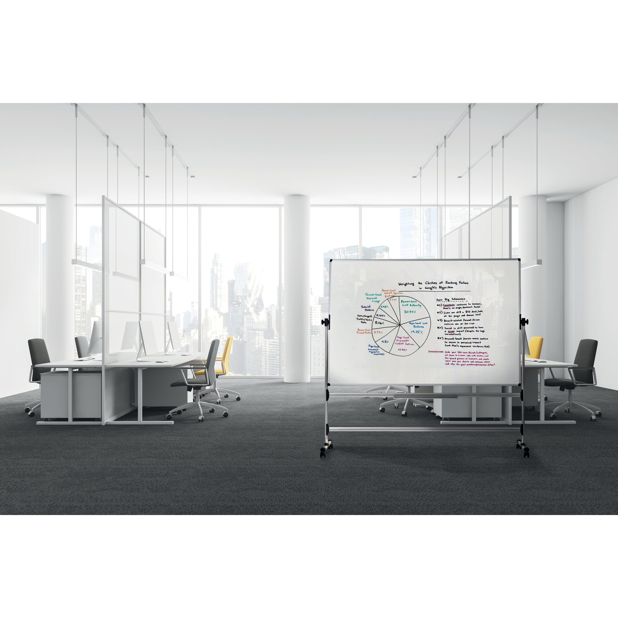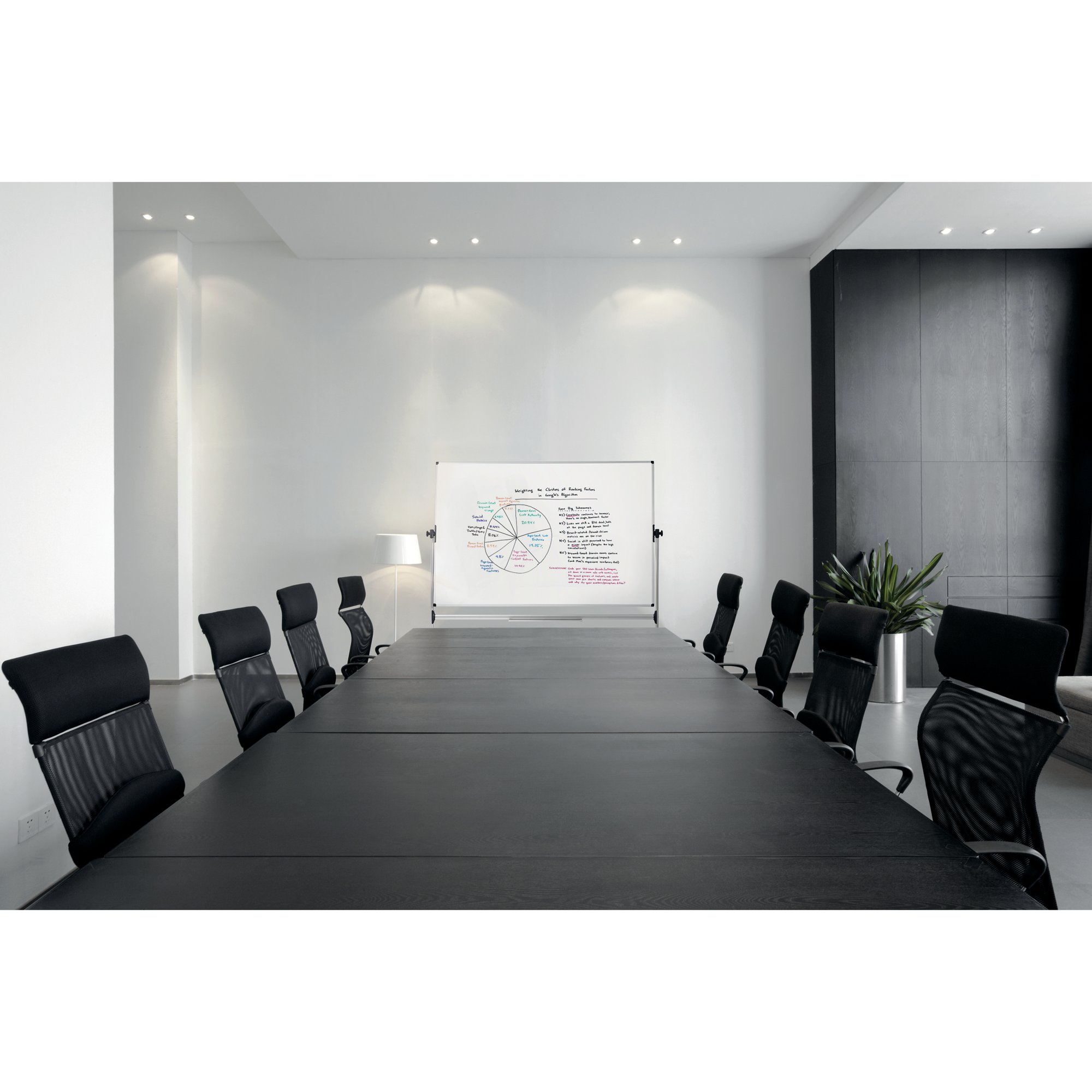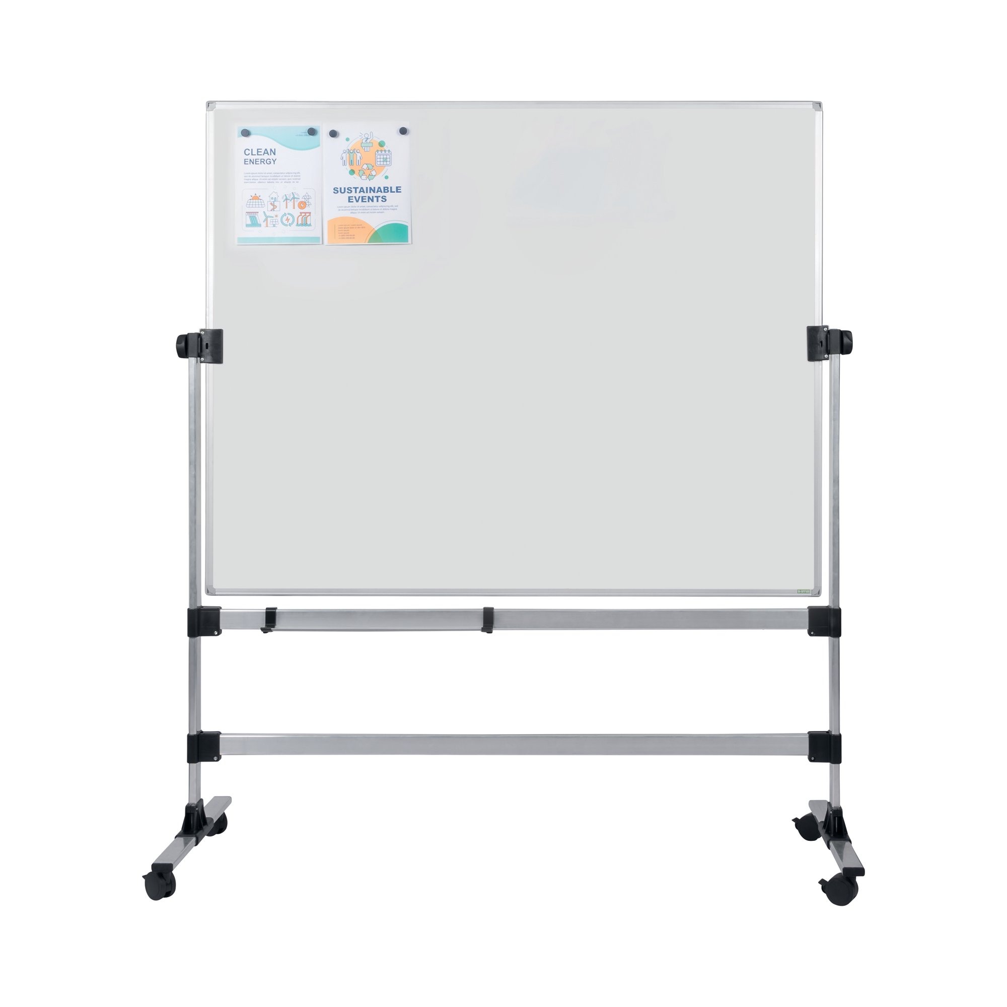 The Bi-Office Earth Revolving Mobile Whiteboard is the perfect solution for any office or classroom setting. It has double the writing area that can be used by simply rotating the board. This also allows for information to be previously prepared and hidden until required. The dry-wipe ceramic surface is scratch-resistant, enables seamless writing and its ideal for intensive use (25-year warranty). You can write and draw, erase it and do it all over again. Brainstorm ideas, plan, better explain a subject or just let the creativity flow. All in one place. You can also enhance your presentations by using magnets to display information, post notes or pictures. The product structure is in natural aluminium, making it light, yet sturdy and durable, and also easily moved between rooms due to the 4 locking castors. This is an ideal product for schools, training centers, after-school activity centers, or even offices, meeting rooms, and laboratories. The Earth Revolving Whiteboard is a Cradle to Cradle certified product. Its recycled and recyclable components match our companys green mindset. Protecting our planet starts with each one of us: making sustainable choices is how you change the world for the better.