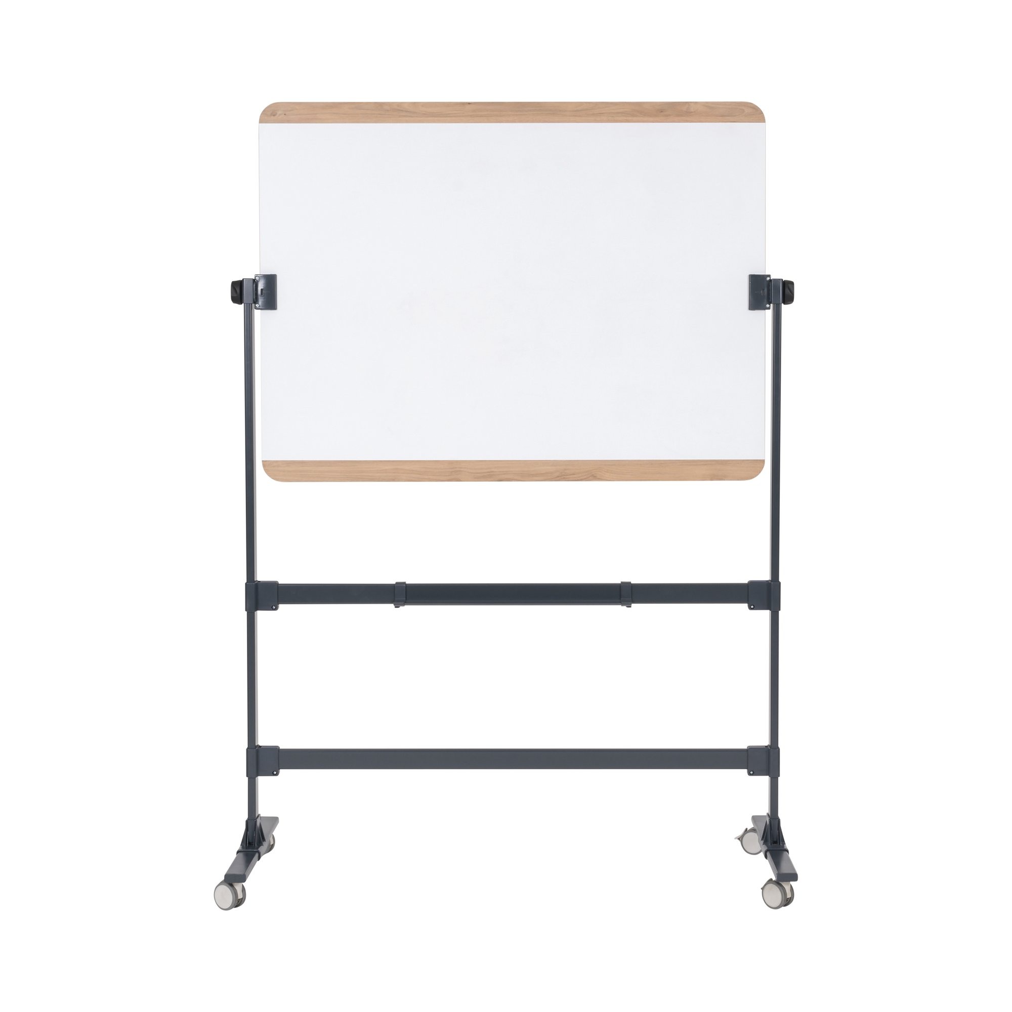 The Ace mobile board is a versatile and stylish solution for your presentation and brainstorming needs. It combines the practicality of a magnetic writing surface, framed within a sleek wood frame and anthracite structure, creating a sophisticated and functional addition to any workspace. The double-sided surface offers a smooth and responsive writing experience. Its high-quality construction ensures that your markers glide effortlessly across the surface, allowing you to capture your ideas, create visual presentations, or illustrate concepts with ease. The magnetic properties of the surface also enable you to attach important documents, notes, or visual aids using magnets, providing added flexibility and organization. The wood frame and anthracite structure add a touch of refinement to its overall design. The natural warmth and beauty of the wood frame complement the modernity of the lacquered steel surface, creating a harmonious blend of traditional and contemporary elements. The anthracite structure not only enhances the visual appeal but also provides stability and durability, ensuring that the easel remains steady and secure during your presentations or brainstorming sessions. One of the standout features of this mobile board is its mobility. Equipped with smooth-rolling casters, it can be easily manoeuvred from room to room, making it an ideal solution for dynamic environments where collaboration and flexibility are essential.