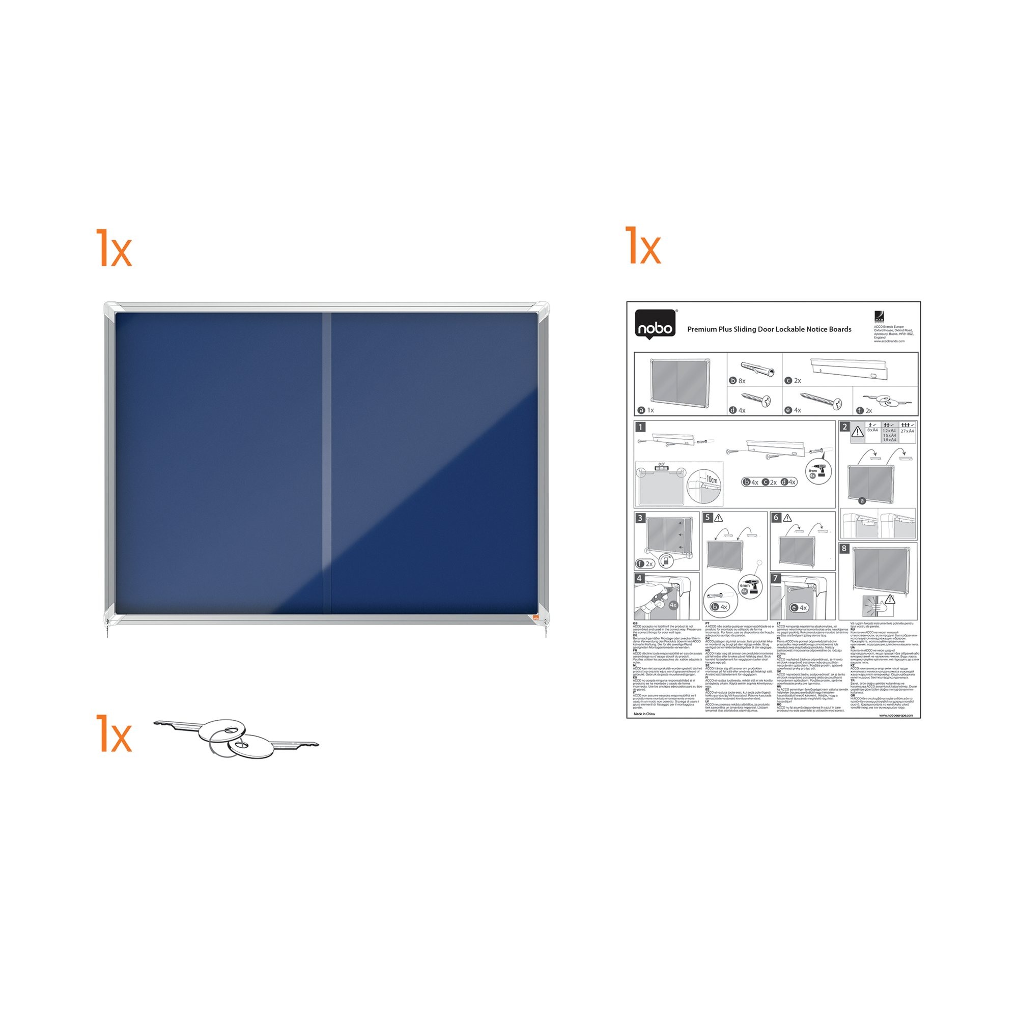Felt lockable notice board with sliding glass doors and unobtrusive integrated corner lock. Complete with a modern stylish aluminum trim and fixed with a rail and through corner wall mounting. Excellent felt notice board surface to securely pin and display your notices. Size: 8xA4 sheets.