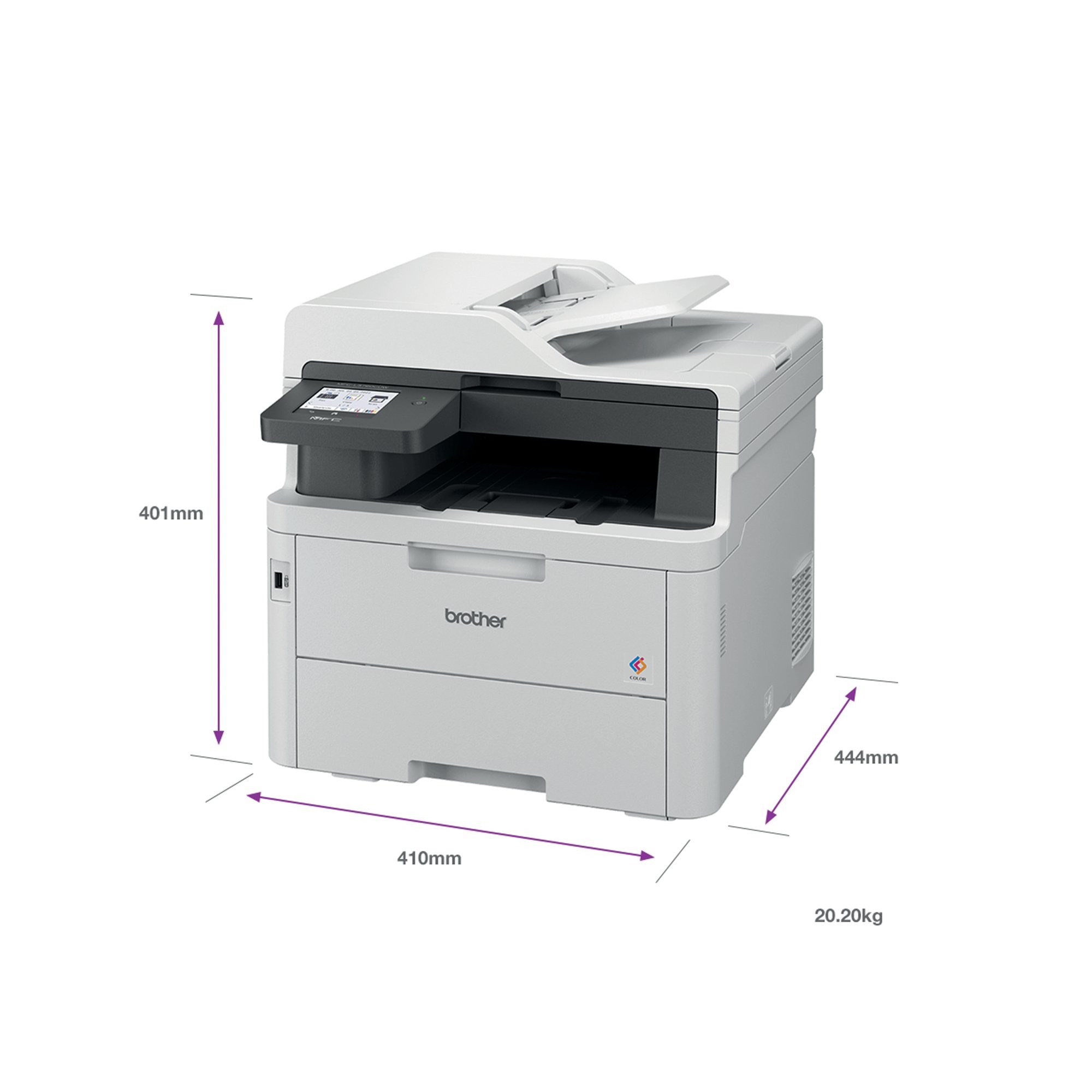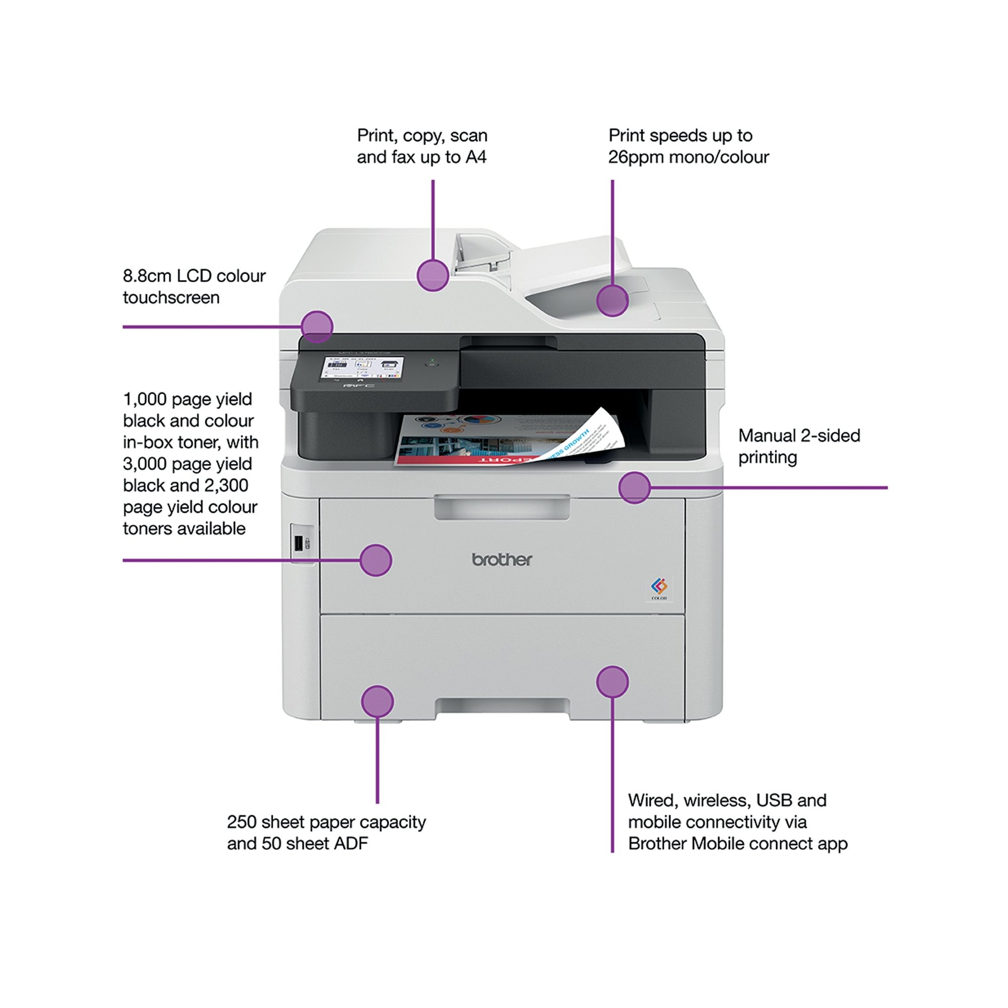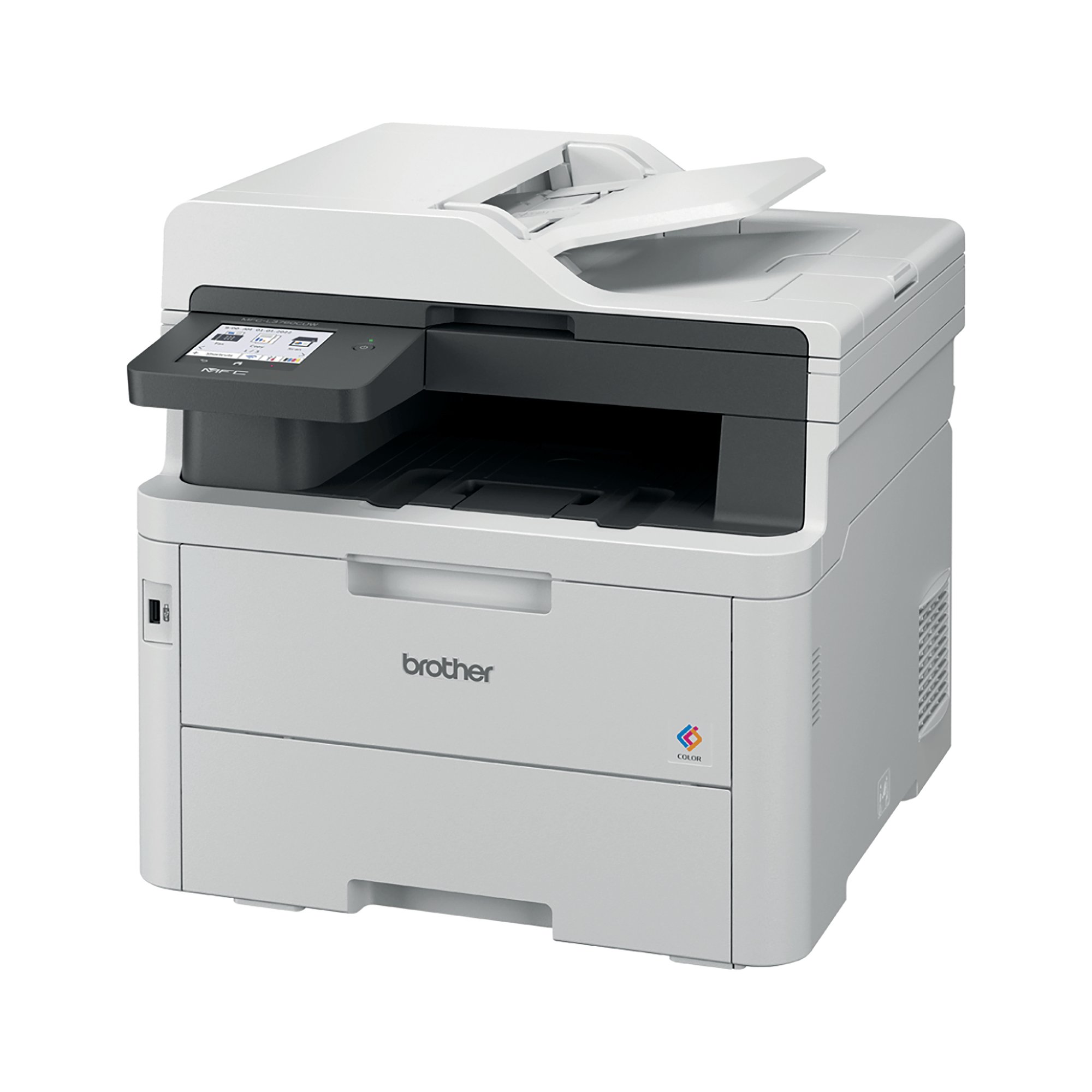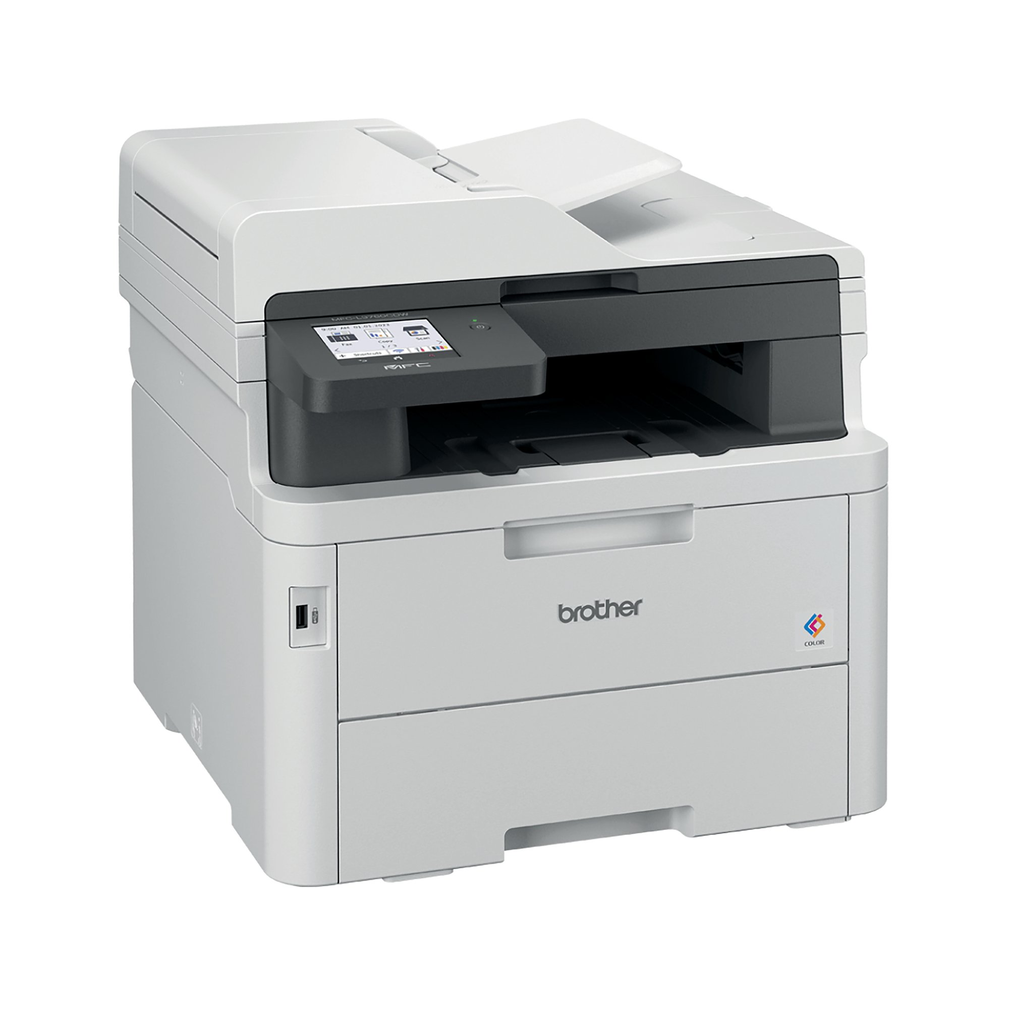 Brother colour LED printers are expertly engineered to help boost productivity in your home or small office. The Brother MFC-L3760CDW A4 colour LED multi-function printer can print, copy, scan and fax. Providing excellent quality and fast print and copy speeds of up to 26 ppm mono/colour. With a scan resolution of up to 1200 x 1200 dpi (mono and colour), able to scan up to 27 ipm mono/21 ipm colour, includes Scan to email, image, OCR, file, FTP, network folder (Windows only), SharePoint and to USB. With a 33,600 bps Super GS Fax, capable of PC Fax send and receive, and up to 350 location broadcast. Designed to be quiet, with a user-friendly interface, ready to begin printing straight out of the box. This printer utilises LED technology to produce professional quality colour prints, adding impact to those important documents. With an internal memory of 512MB of direct data to easily process your documents. Secure by design, it uses triple-layer security at a device, network and document level, with the latest industry-standard security features to securely protect your data, maintaining the integrity of your data at every step. Connect with Gigabit Ethernet, Hi-Speed USB 2.0, USB host (front), Wireless 2.4 and 5GHz with Wi-Fi Direct and Mobile printing via Mobile Connect, Brother Print Services Plug-in, AirPrint, Mopria, Brother apps and WebConnect. Manual 2-sided printing. A generous 250 sheet paper tray capacity 50 sheet ADF and a manual feed single sheet slot. All controlled via an 8.8cm colour touchscreen. Supplied with a 1,000 page yield black and colour in-box toner.