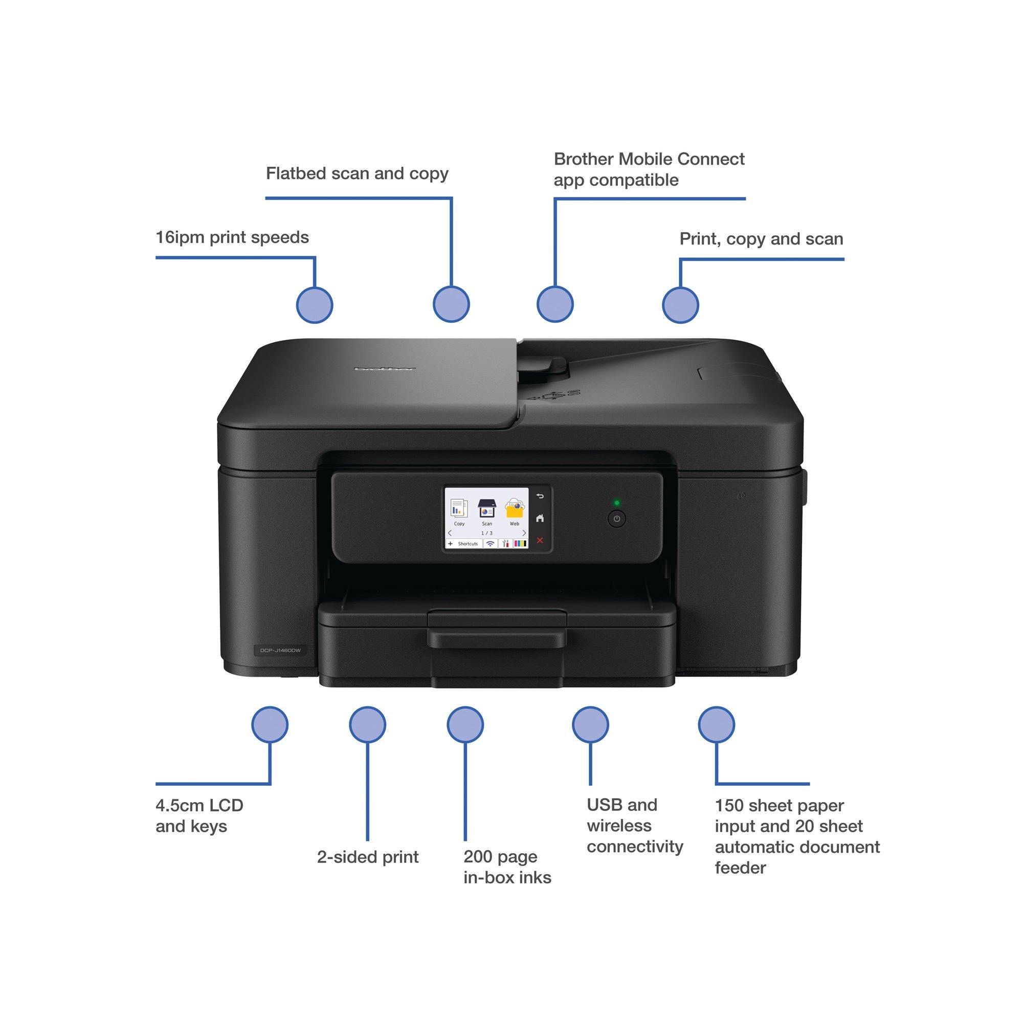 Experience seamless printing from anywhere with the compact and flexible DCP-J1360DW, equipped with a colour display and an automatic document feeder for added convenience. Easily print, scan and copy from one device. Wireless connectivity makes it easier for everyone in your household to print from their laptop or mobile device.