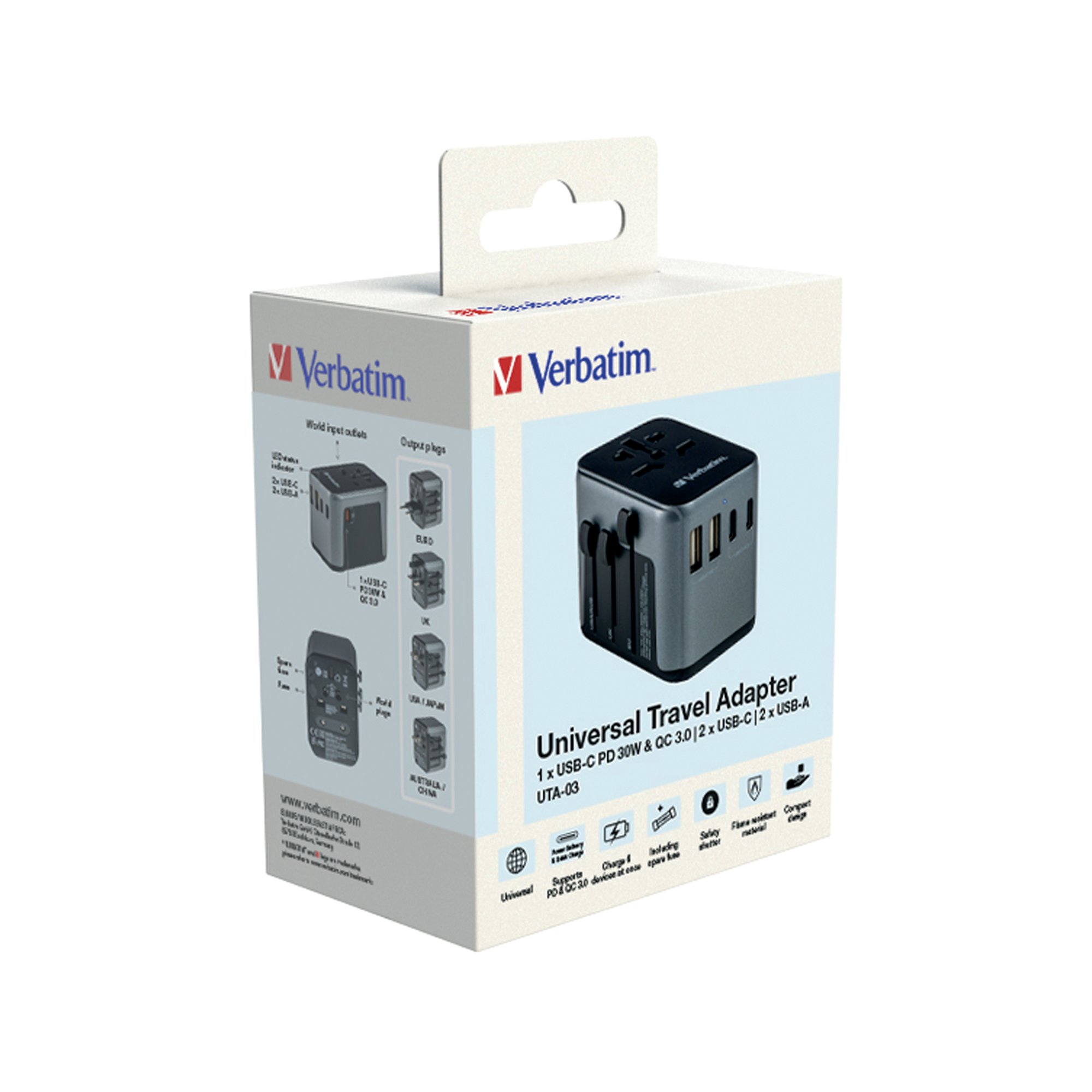 The Verbatim Universal Travel Adapter can be used in more than 180 countries - take it everywhere with you and never be out of power. This world-to-world multi plug will allow you to connect to any local power supply around the world and recharge your power-hungry devices, like laptops and camera batteries. The USB-C and USB-A ports on the bottom can charge all your USB devices including smartphones, Bluetooth speakers, tablets, power banks, and Kindles.