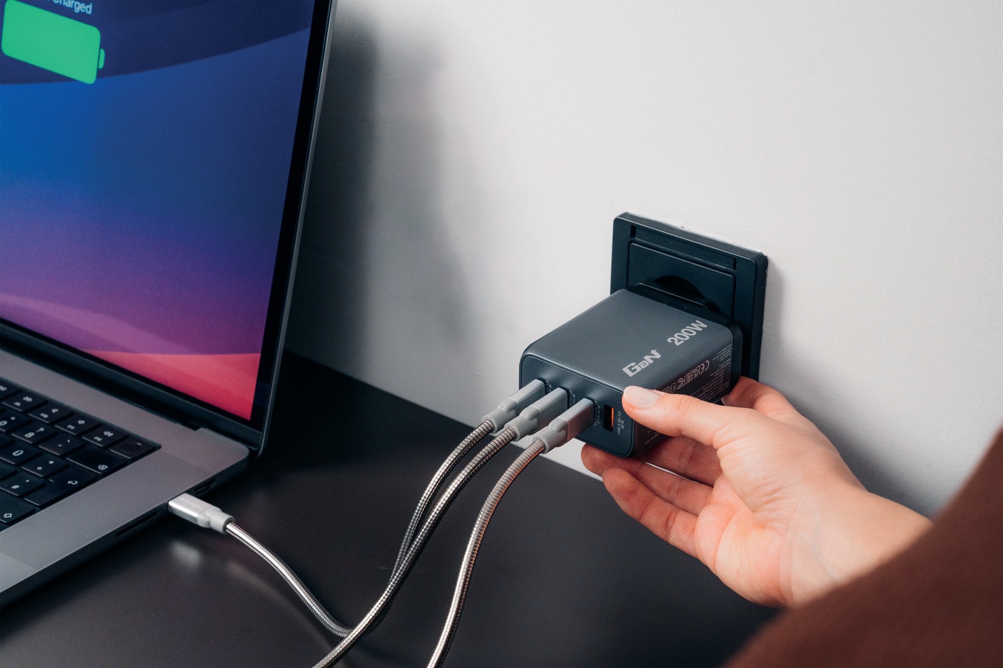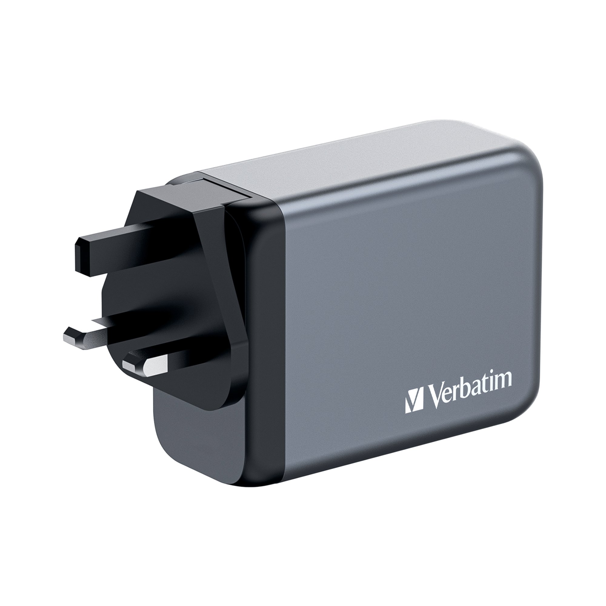 Verbatim's 200W GaN Wall Charger combines two USB-C PD 100W ports, one USB-C PD 65W port and one USB-A QC 3.0 port in a sleek, palm sized design. Ideal for the office, home or travelling to power your laptop, tablet, smartphone, gaming devices, and more. With its foldable US prongs and replaceable EU and UK plugs, it's the ultimate travel companion. Galliam Nitride (GaN) technology delivers high-powered, fast, efficient charging, and generates less heat. GaN chargers are smaller and lighter than traditional silicon-based chargers, making them ultra-portable and ideal for travel.