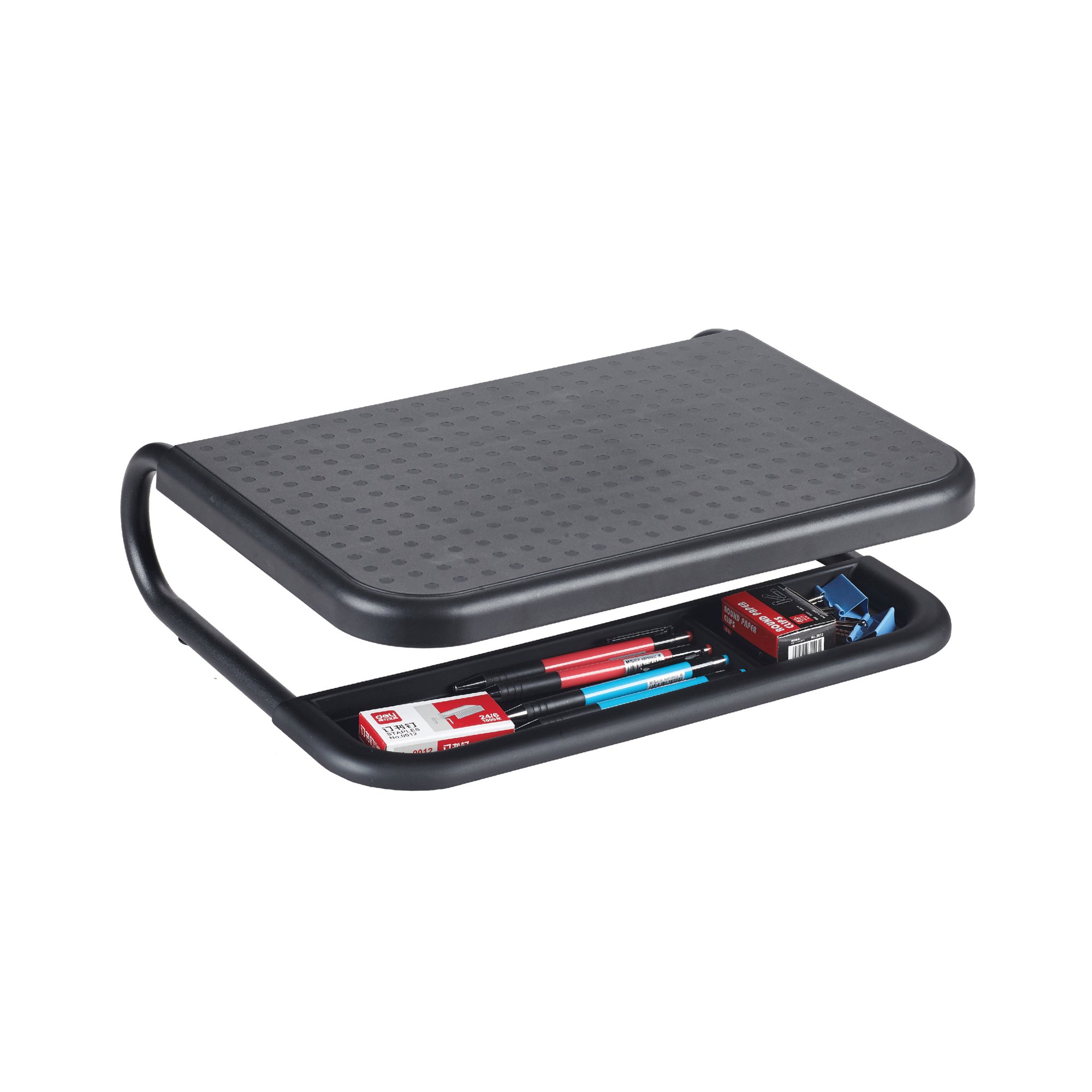 Monitor stand with non-skid padded platform. It has a large storage area underneath with a cable manager at the back. Ergonomic and comfortable, elevate your screens to a more comfortable viewing height, reducing neck strain and relieving stress from prolonged work or gaming sessions. The monitor stand riser has a universal size design that is compatible with printers, computers, telephones and laptops. It also features a ventilated design to prevent overheating. The non-slip rubber pads provide stability during use.