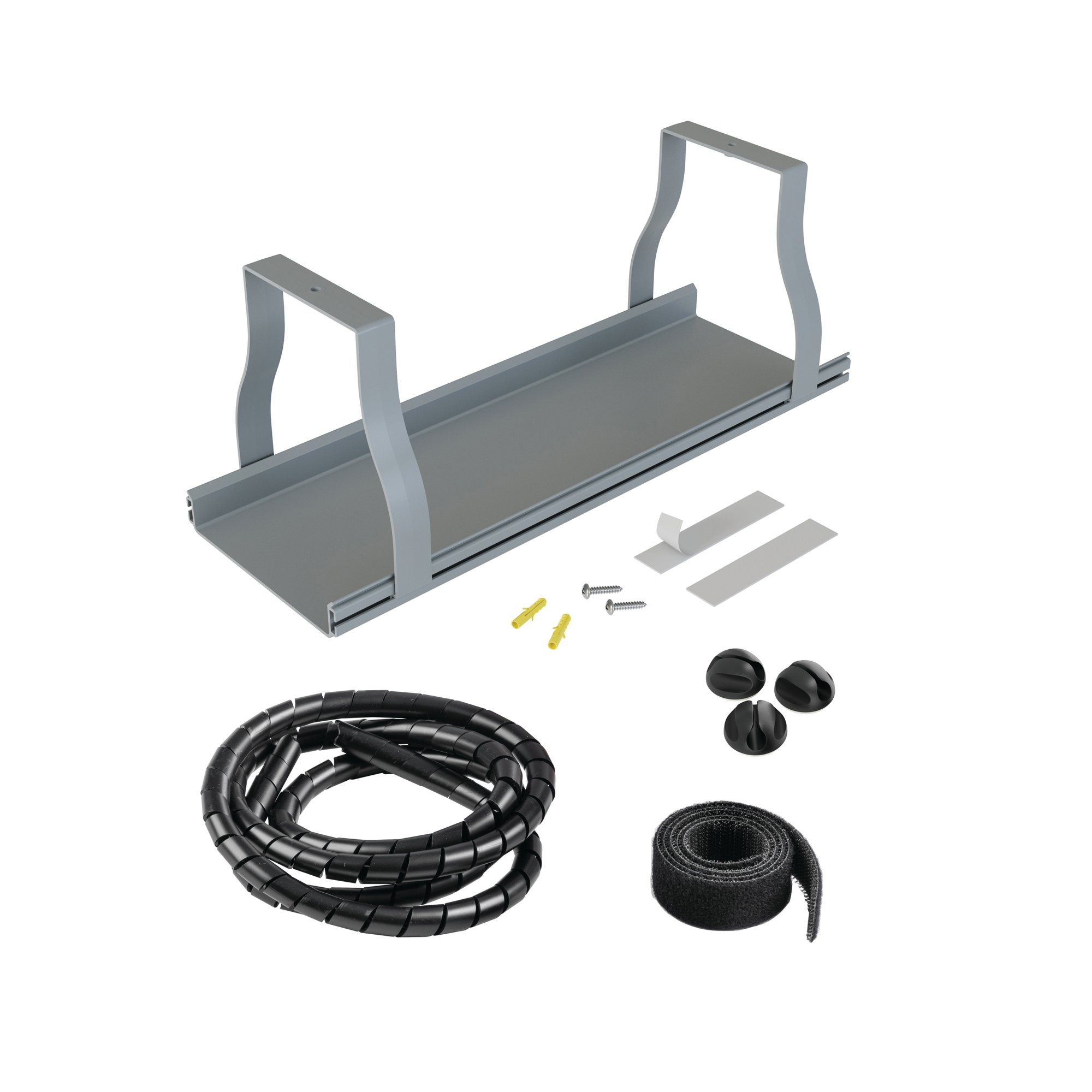 Use Desk Cable Organiser Kit to keep floors free of cables, and keep unsightly cables tidy and in reach around desks. Contents: 1x Under desk Tray, 1.25m length Spiral Wrap, 3x self adhesive Cable Tidy Bases, 600mm Hook & Loop Band.