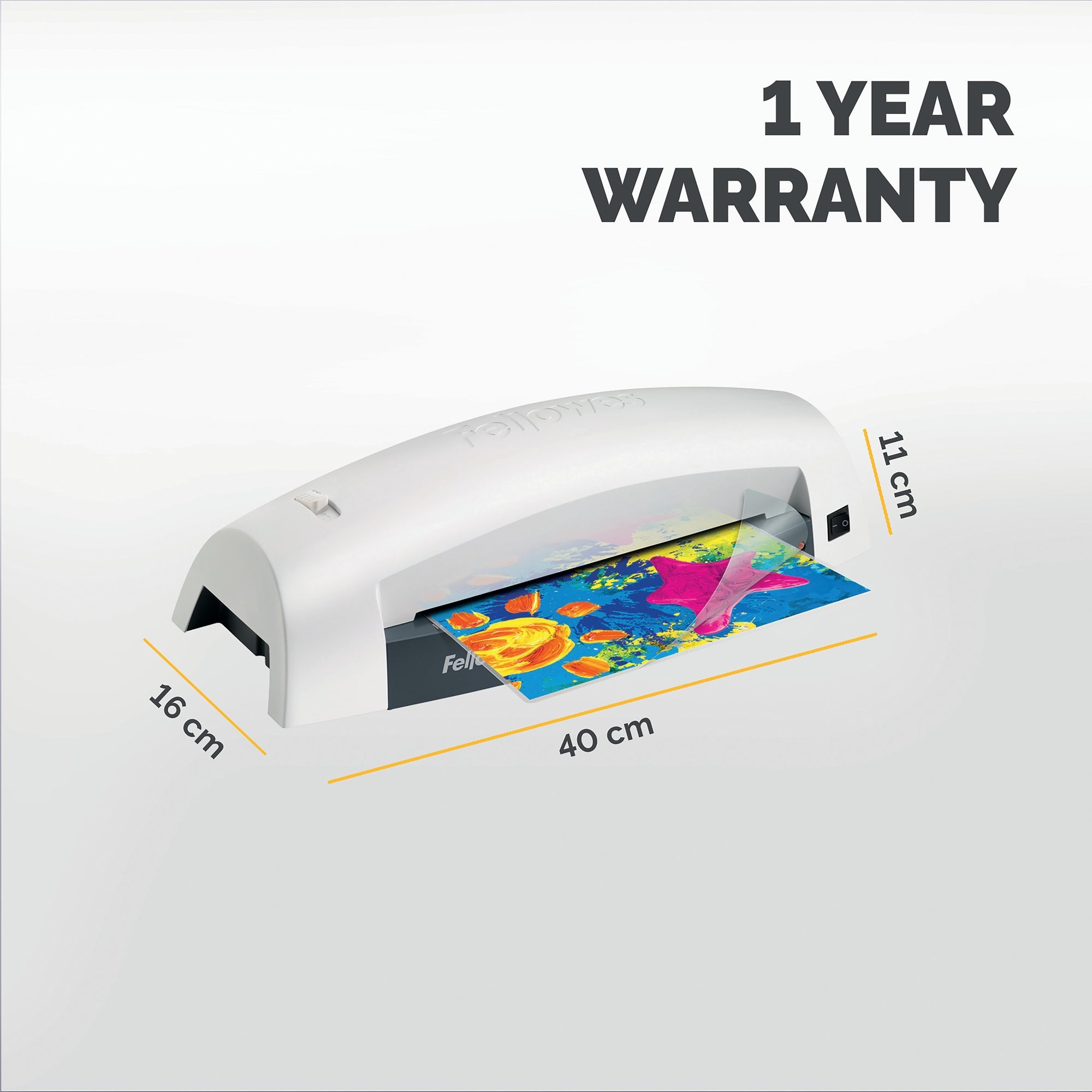 The Fellowes Lunar A4 laminator is Jam Free when used with Fellowes branded laminating pouches as it features a release lever which allows you to realign documents that have been misfed into the laminator. This home use laminator machine can laminate up to 125 micron laminating pouches which is perfect for laminating your important documents or giving you a professional finish to your photos or personal projects. After a 4 minute heat up time, a green light indicates that your Lunar A4 laminator is ready for use. It's Sleep Mode feature will cause the machine to shut off after 30 minutes of inactivity. Your Fellowes A4 laminator includes a 10 document starter pack with samples of Fellowes laminating pouches that give a superior finish to your laminated work.