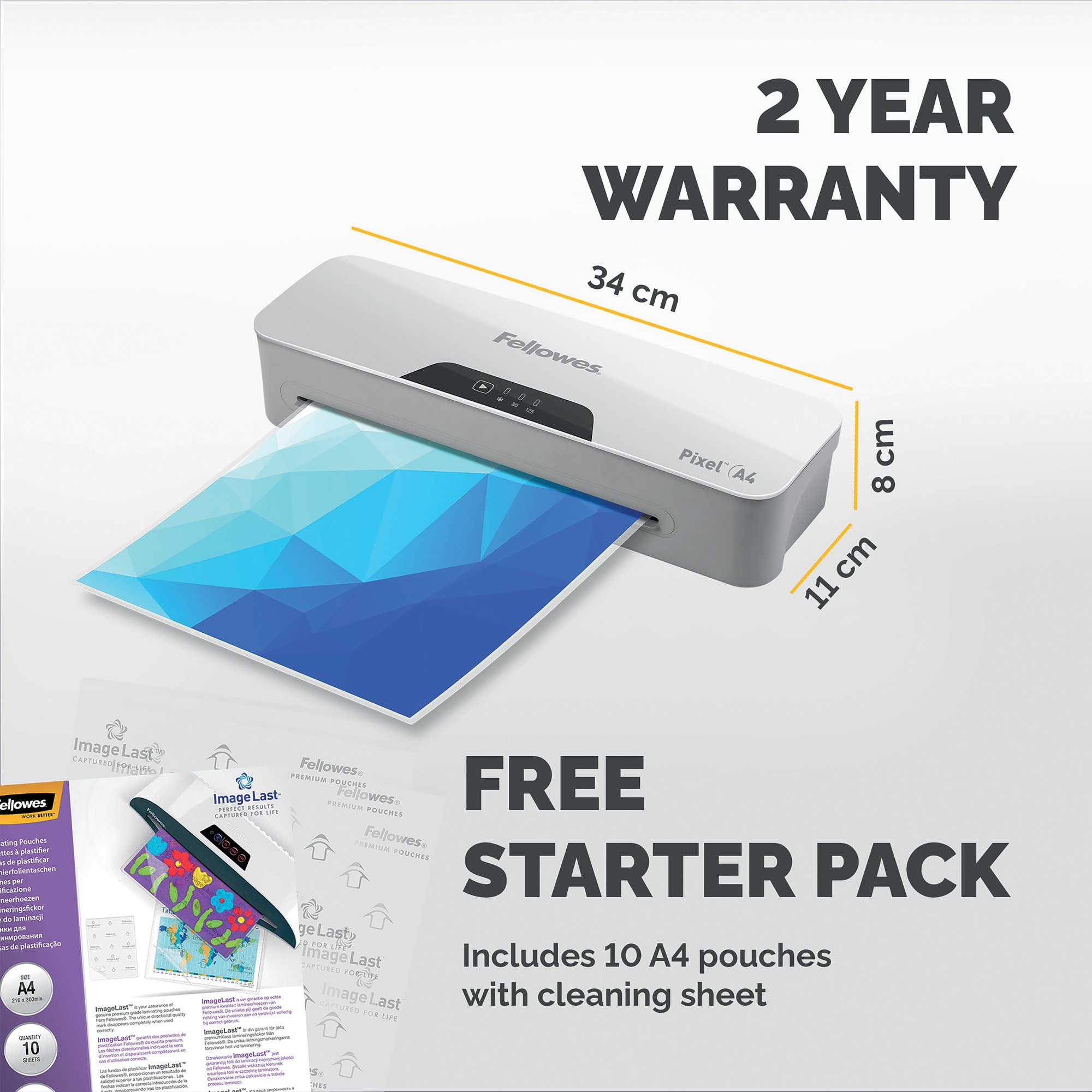 The Fellowes Pixel A4 home office laminator is jam free when used with Fellowes branded laminating pouches as it features a release lever which allows you to realign documents that have been misfed into the laminator. This Fellowes home office use laminator machine can laminate up to 125 micron laminating pouches, ideal for laminating your important documents or giving you a professional finish to your photos or personal projects. After a 3 minute heat up time, your Pixel A4 laminator is ready for use. A Jam release lever helps prevent paper jams by allowing the user to remove and realign misfed documents. Its sleep mode will be activated after 30 minutes of inactivity. Your Fellowes A4 laminator comes with a handy 10 document starter pack with samples of Fellowes laminating pouches, allowing you to get laminating straight away.