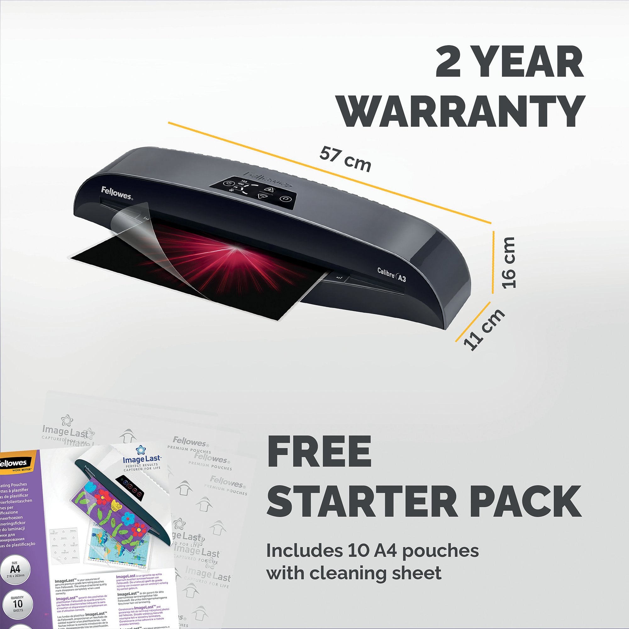 The Fellowes Calibre A3 laminator is Jam Free when used with Fellowes branded laminating pouches as it features a laminator feed sensor which indicates when a document has been misfed then auto stops and reverses the machine for the document to be realigned by the user. This small or home office use laminator machine can laminate up to 125 micron laminating pouches and when switching to different pouch thicknesses, there's no need to wait for the laminator to heat or cool due to the innovative HotSwap technology. Built for convenience, your Fellowes A3 laminator is ready to laminate in as little as 30 seconds from switching it on with InstaHeat technology, and after 30 minutes of inactivity the laminating machine powers down automatically. Featuring Heat Guard technology, the laminating machines surface temperature is reduced, ensuring that your Calibre A3 laminator is always safe to touch - perfect for peace of mind in any home environment. Your Fellowes A3 laminator includes a 10 document starter pack with samples of Fellowes laminating pouches that give a superior finish to your laminated work.