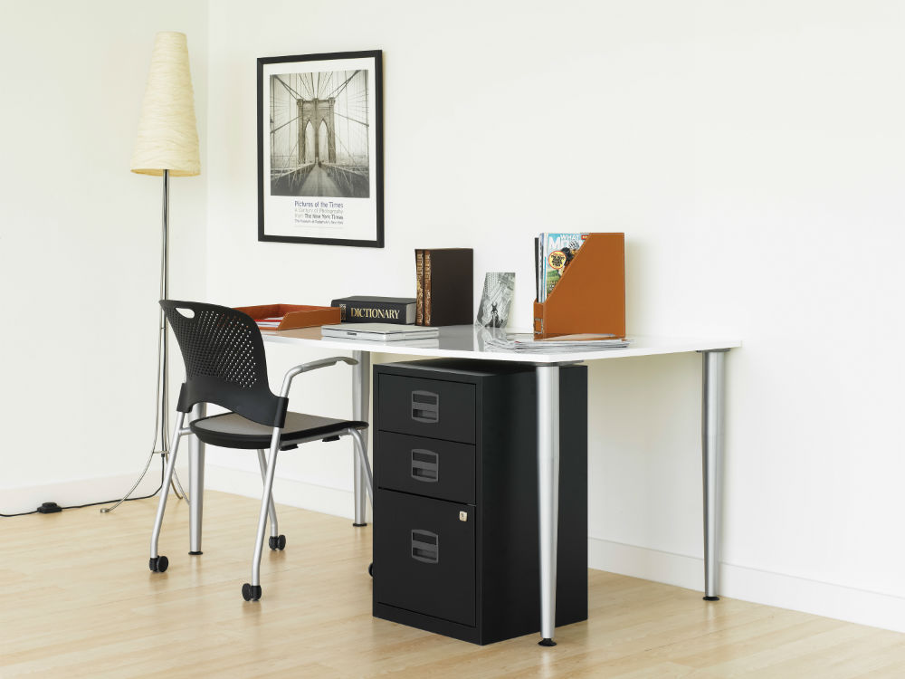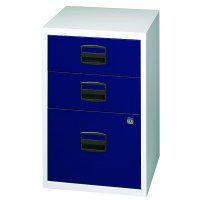 Affordable and spacious, this Bisley Home Filing Cabinet is a great filing cabinet for the home or small office. It features three drawers for A4 document storage and filing, with a single action lock for the bottom 2 drawers to help keep confidential documents secure. The drawers feature ball bearing runners for smooth and effortless movement. This free standing cabinet has a grey carcass with stylish blue drawers, measures 413x400x672mm and has a maximum capacity of 15kg.
