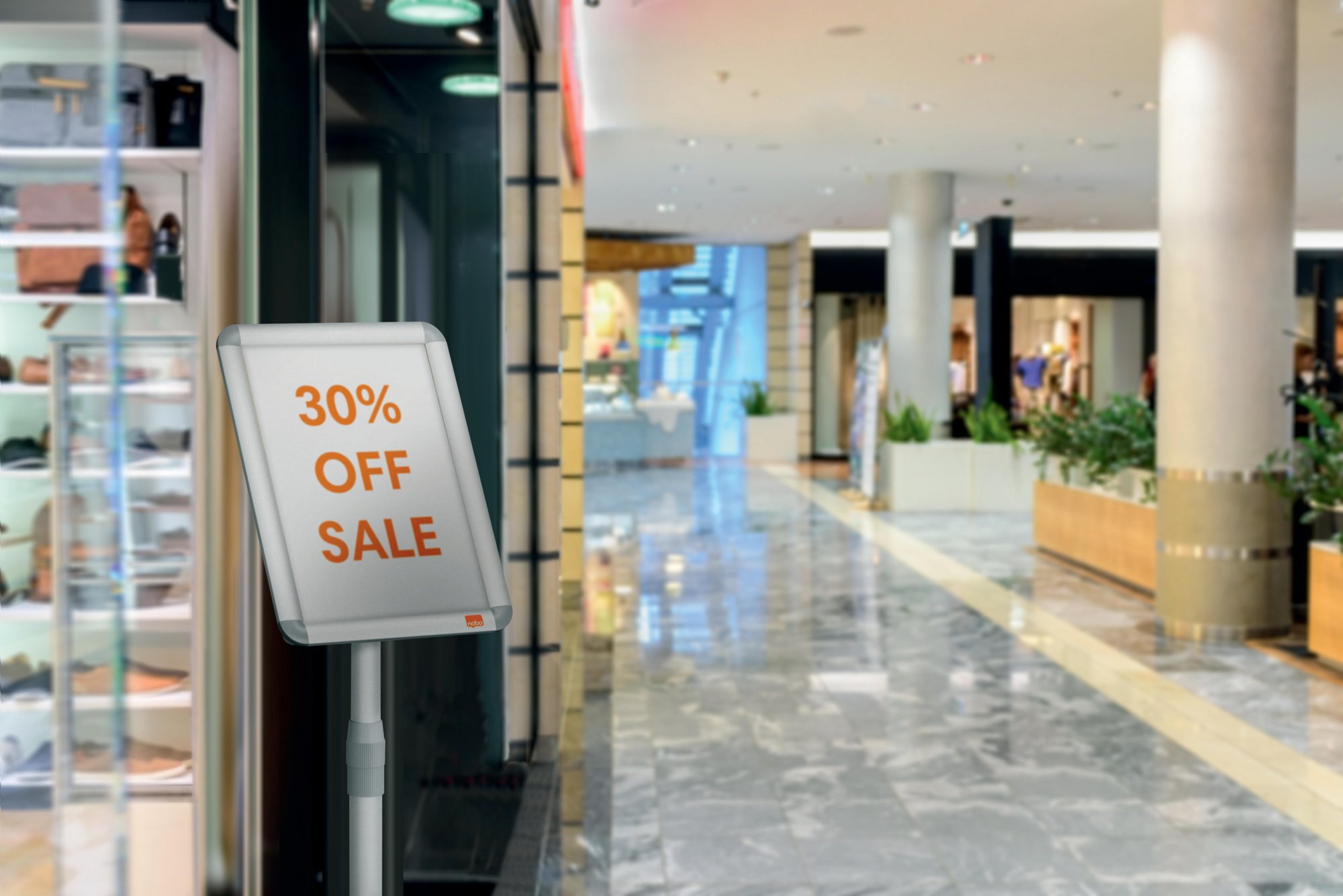 A3 poster frame stand for the clear display of posters, signs and important information. The smart aluminium snap frame trim allows easy poster change and provides a professional finish. This freestanding display stand is an ideal portable sign holder solution. The stand is height adjustable from approximately 850mm to 1400mm high and the poster frame can be positioned in portrait or landscape orientation. protective anti-glare cover surface. Display area A3.