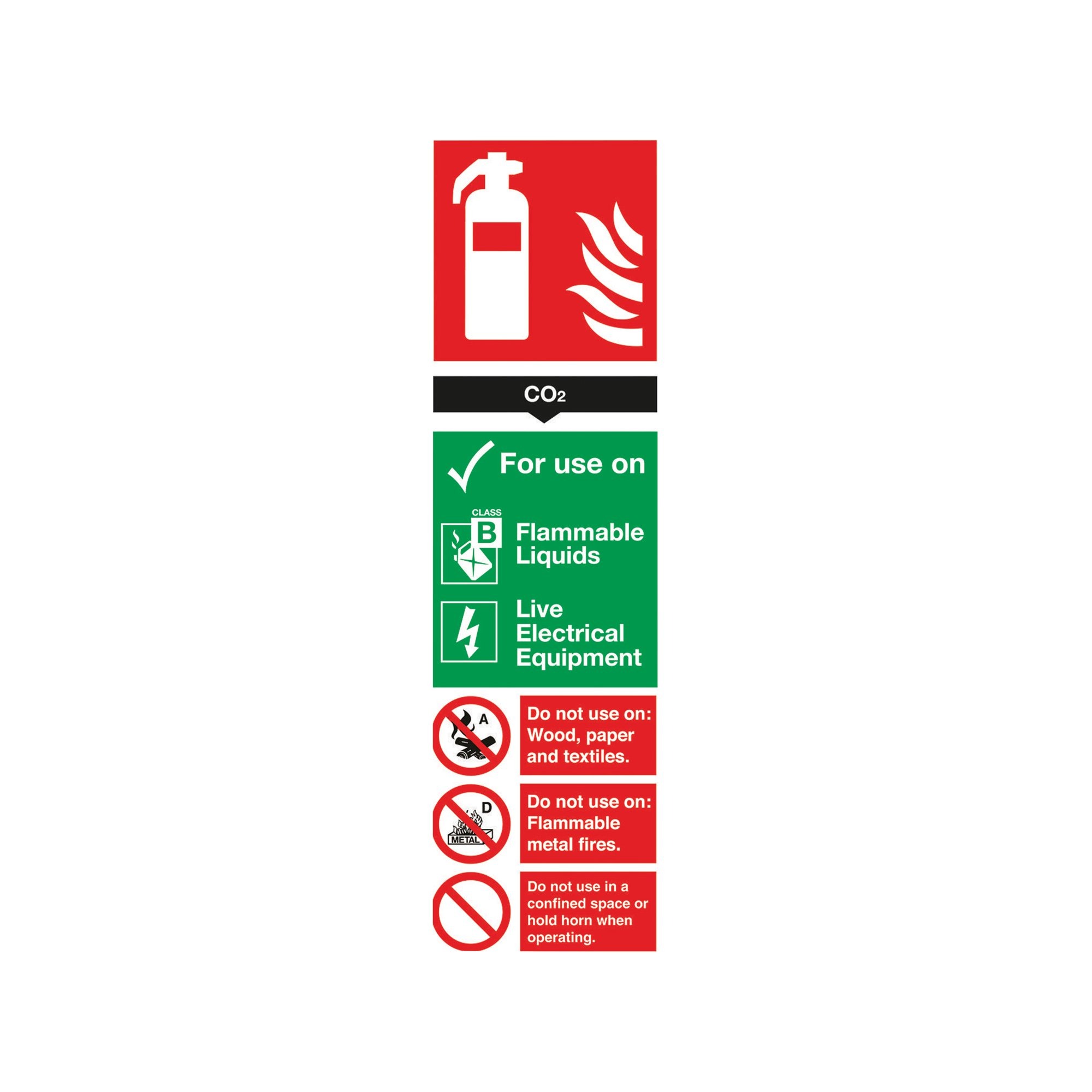 This sign details safe applications for carbon dioxide fire extinguishers. Simple to understand, using recognisable symbols and a universal colour scheme, this sign keeps employees, customers and visitors informed in the event of a fire. This rigid PVC sign measures 300 x 100mm.