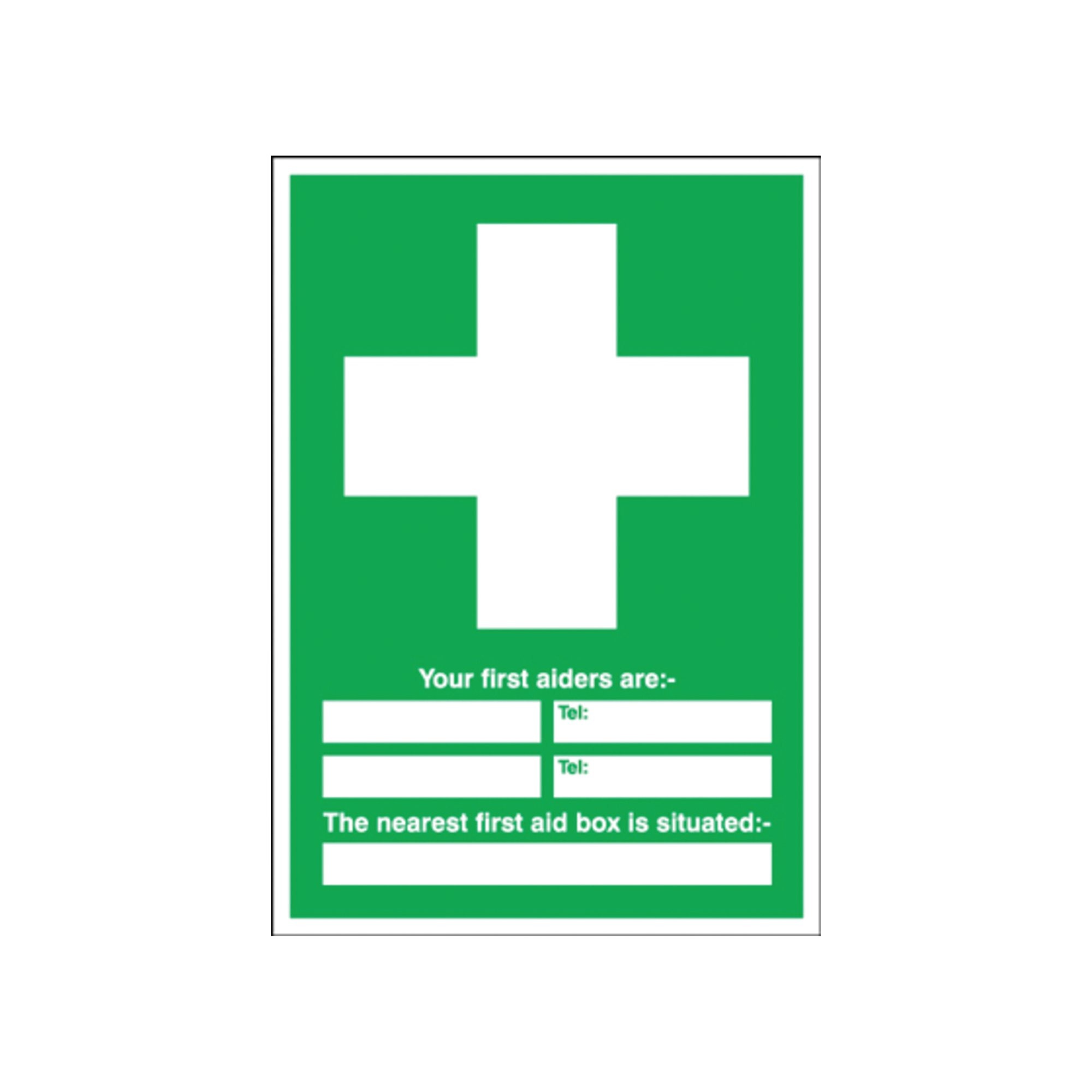 The sign informs staff of the names of the first aiders on site in case of an accident or emergency. The 600x450mm sign includes space for the first aider's name and telephone number, and also has a space for the location of the nearest first aid box. The universal green and white colour scheme instantly categorises this as a safety sign on sight, keeping employees informed and safe at work. The PVC sign can be affixed easily to walls, doors and any other surfaces.