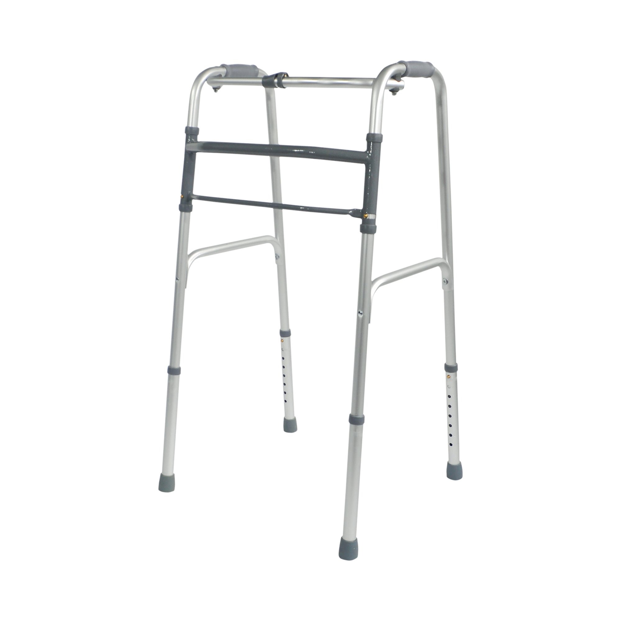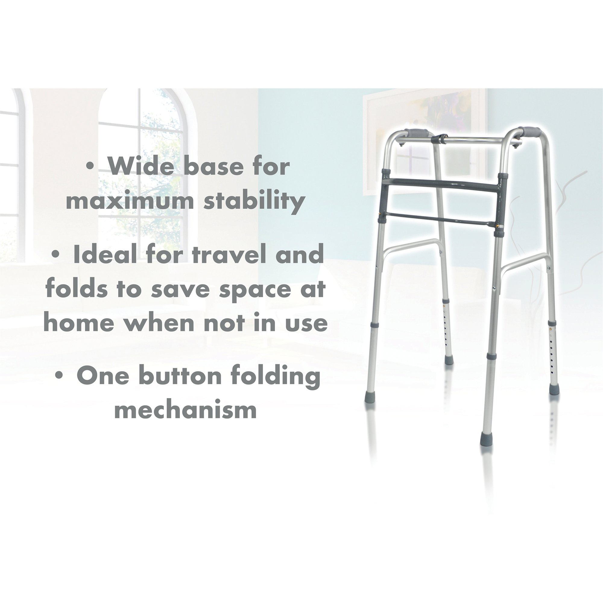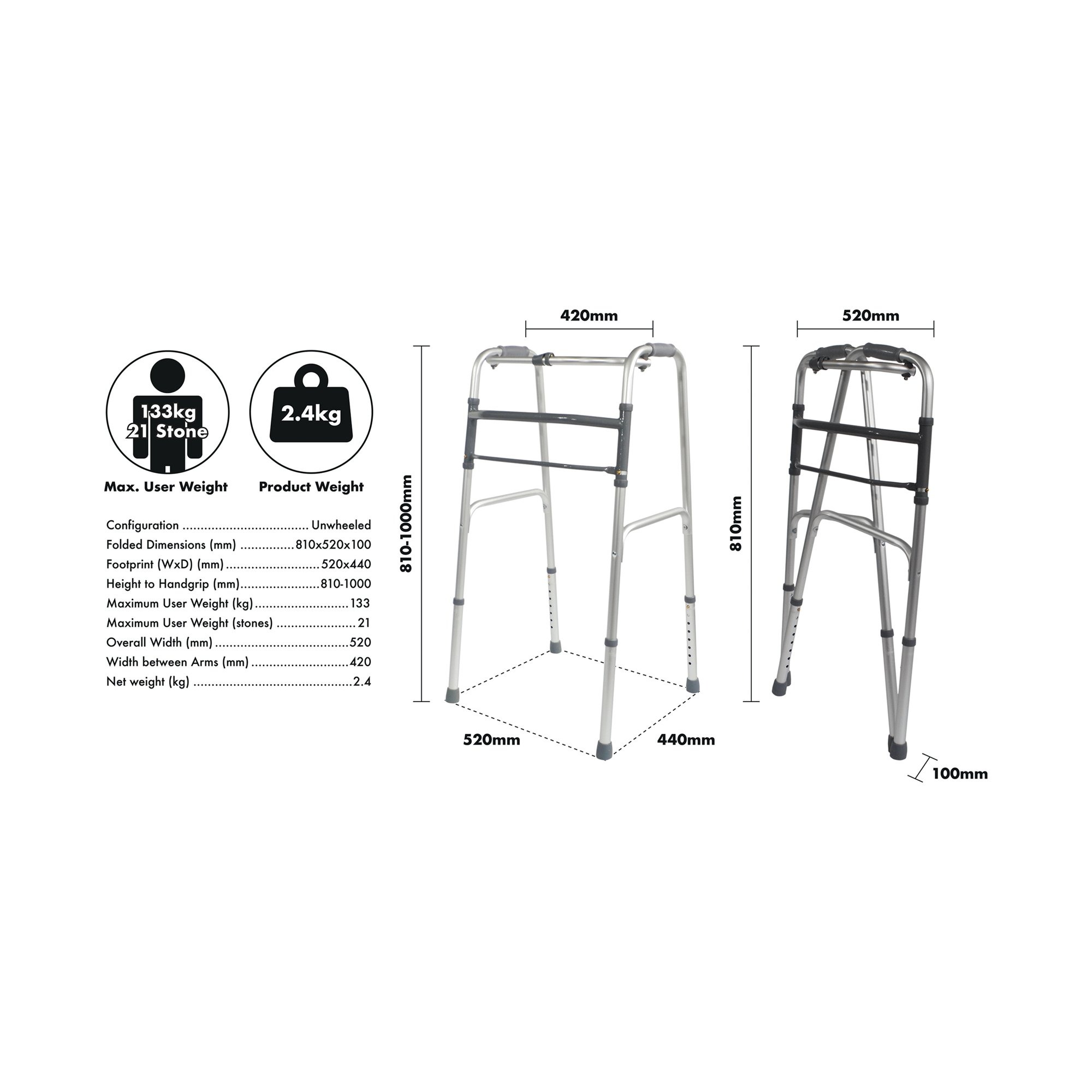Lightweight Aluminium Folding Walking Frame with a wide base for maximum stability, ideal for home use. The lightweight aluminium walking frame features soft grip handles, one button folding function and height adjustable legs. This frame can be folded when not in use and is a real space saver. Ideal for travel use. Maximum User Weight Limit 133kg (21 stone). Supplied without wheels.