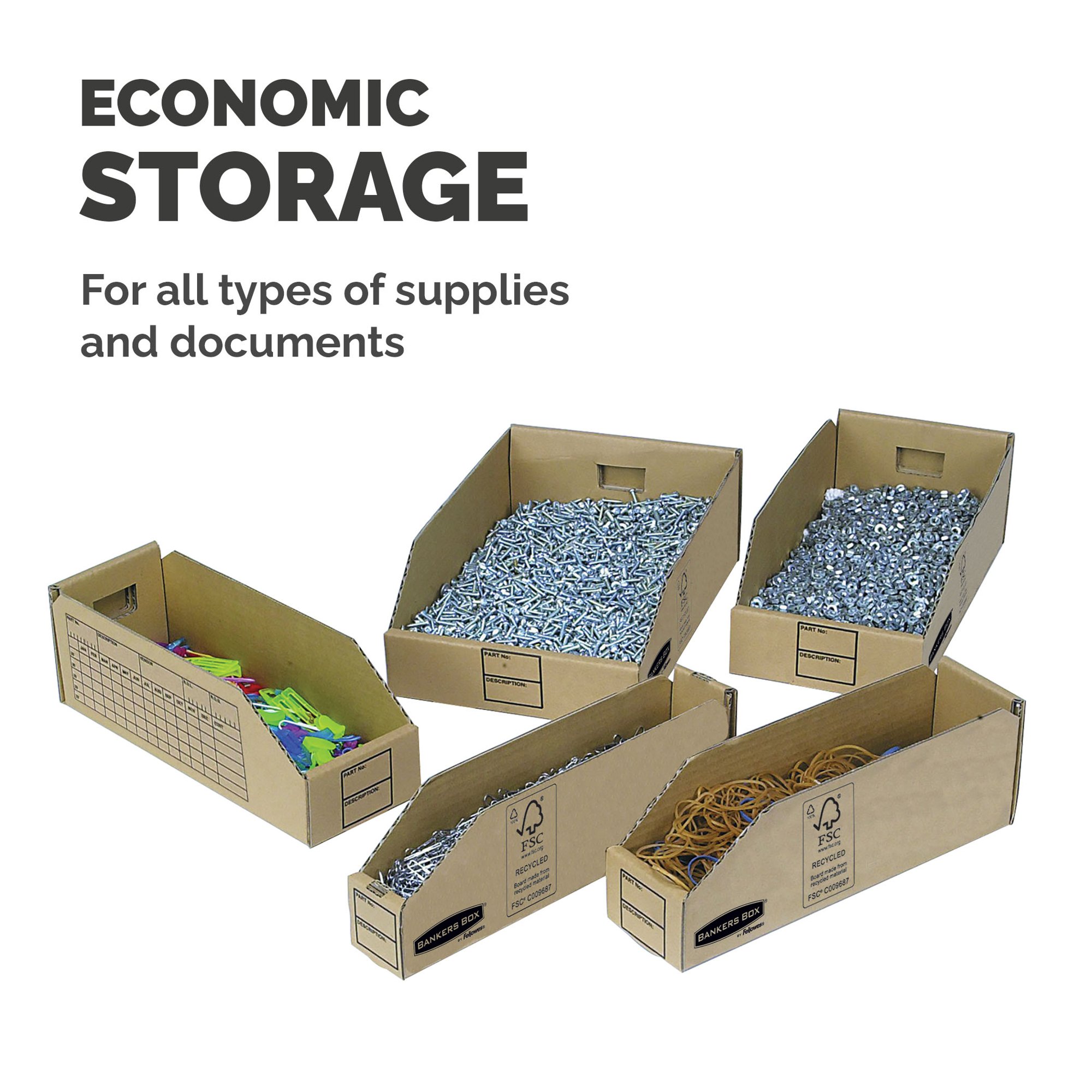 Provide economical storage around your home or office for all types of components, using the Bankers Box Earth Series Parts Bin. Each parts bin features a large labelling area for easy identification of contents at a glance, leaving you free to organise and sort your filing system quickly and easily. These parts bins are environmentally friendly and are manufactured using 100% recycled materials.
