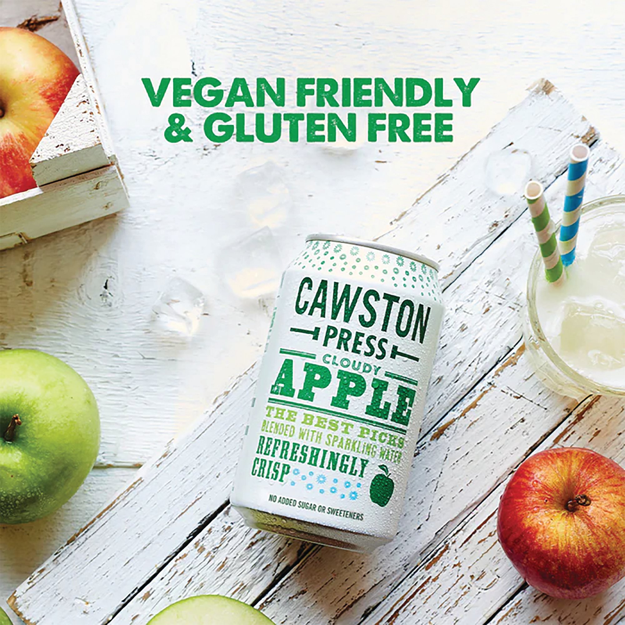 Simply made using pressed Golden Delicious, Jonagold, Gala & Braeburn apples with sparkling water, Cawston Press' Sparkling Cloudy Apple Soft Drink is a thirst quencher sure to liven up your day. Providing an aroma and taste of freshly squeezed apples, it's more than a refreshing choice of drink. This 330ml sparkling cloudy apple drink does contain natural fruit sediment but has no concentrates, sweeteners or added sugars. The drink is vegan friendly, gluten free and supplied in a pack of 24 330ml cans that are fully recyclable.