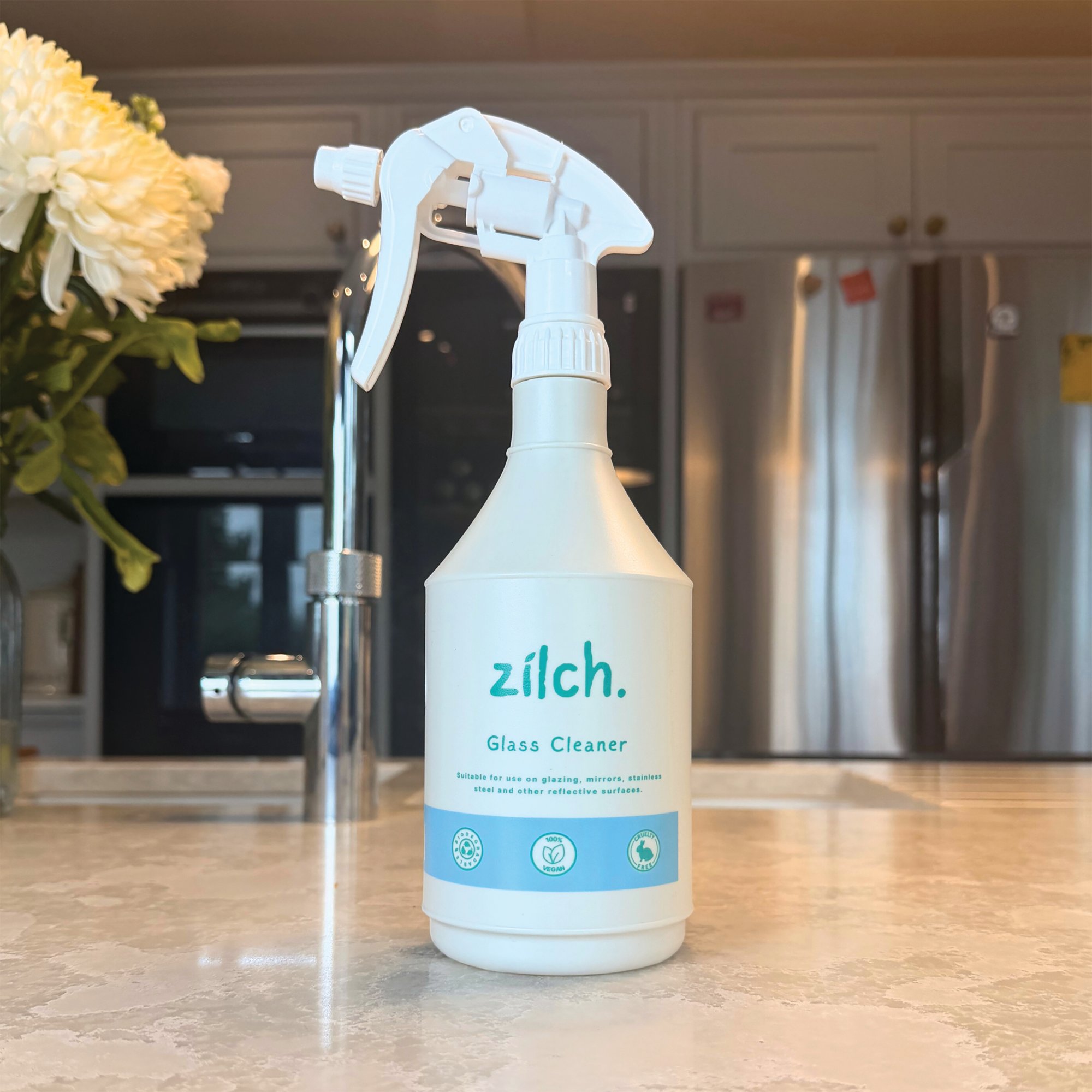 This Zilch, durable, 750ml, refillable bottle is built for everyday use and is fully recyclable. Made from 100% recycled plastic, sourced from used milk bottles, it is designed with clear product information and a fill line for easy refill. Simply drop in the glass cleaner sachet (sold separately), fill with water, give it a shake and it is ready for use.