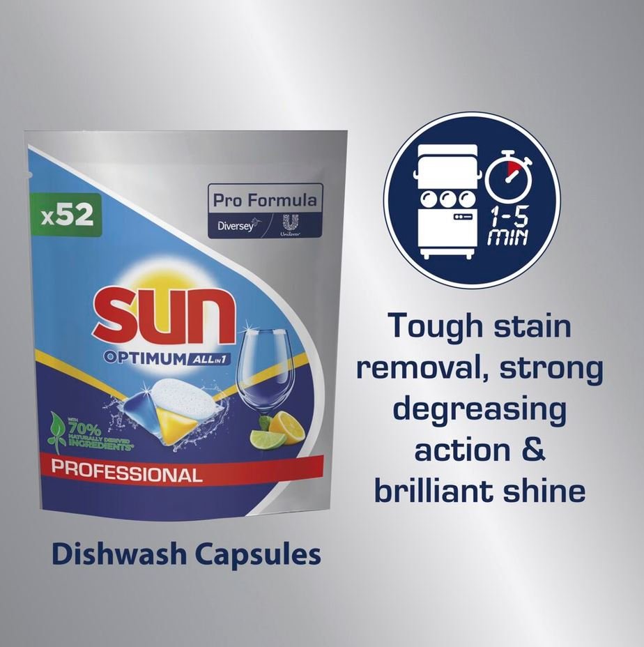 Sun Optimum All in One Professional Dishwasher Capsules by Pro Formula remove tough stains and provide excellent degreasing action and brilliant shine for both household and professional dishwashers. Supplied in recyclable packaging, these capsules are 100% biodegradable and are made with naturally derived materials. Supplied in a pack of 52 dishwasher capsules.