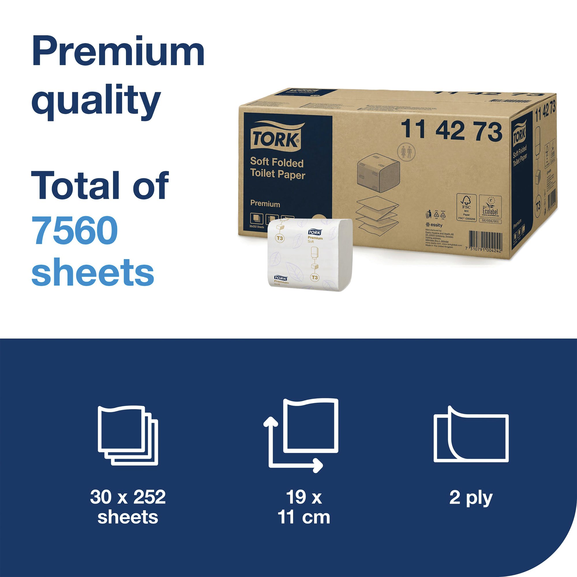 For use in the Tork T3 dispensing system, this folded toilet tissue is designed for sheet by sheet dispensing, for a hygienic, cost effective solution for small to medium traffic washrooms. The premium 2-ply tissue is extremely soft and absorbent, with each sheet measuring 190 x 110mm. Each bundle contains 252 sheets of white paper. This pack contains 30 bundles.