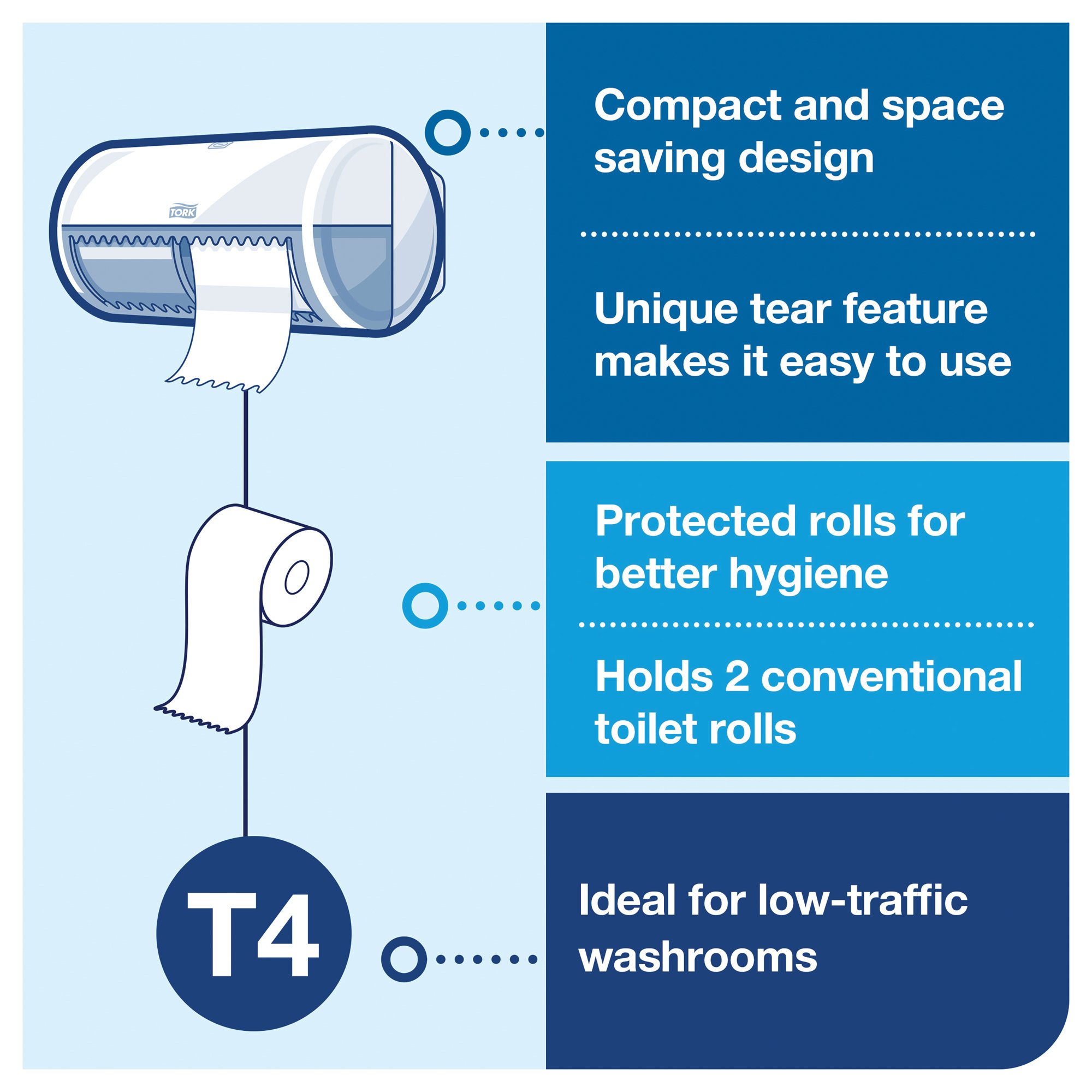 Add luxurious comfort to bathrooms and public toilets with Tork's extra-soft premium toilet roll. Combining superior performance with high brightness, this bulk toilet paper will leave everyone with a lasting impression of quality. Plus, its embossed design will add a further touch of luxury. Use with Tork T4 toilet paper dispensers - they hold two conventional toilet rolls, reducing the risk of paper run-outs and save time on maintenance.