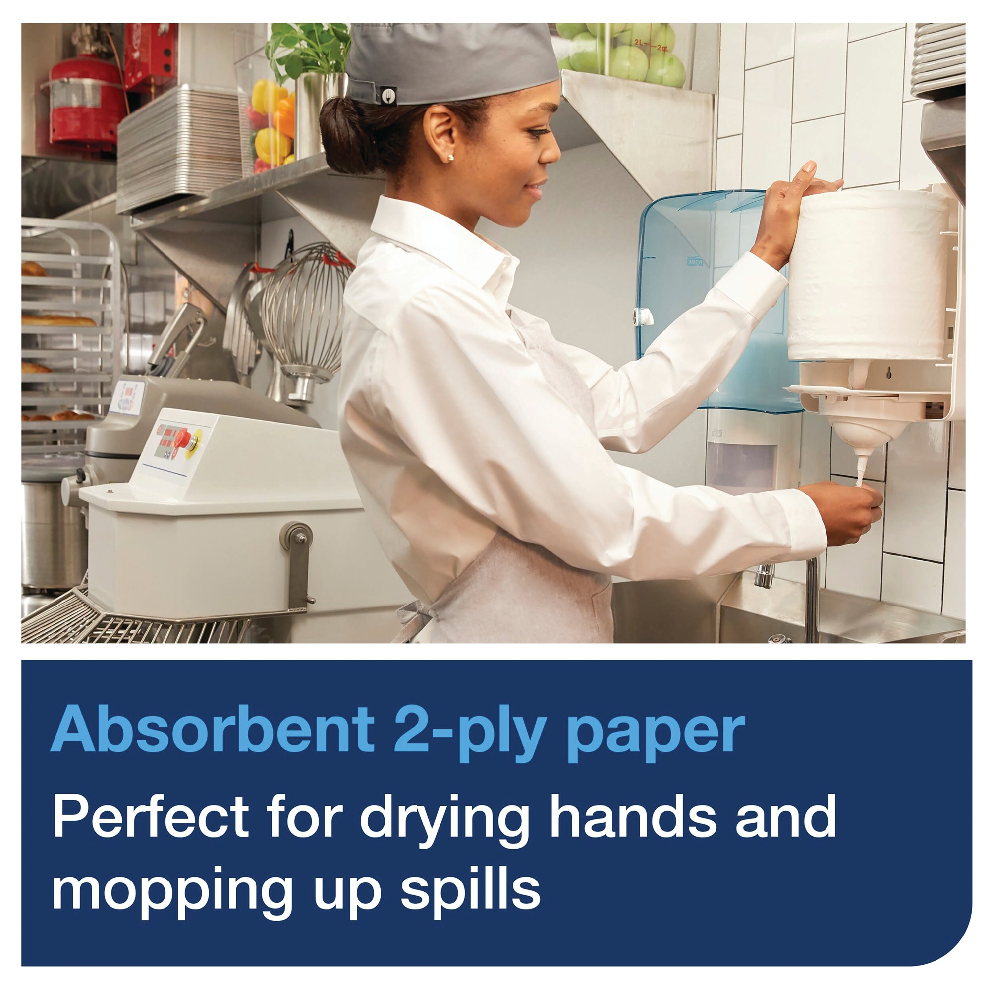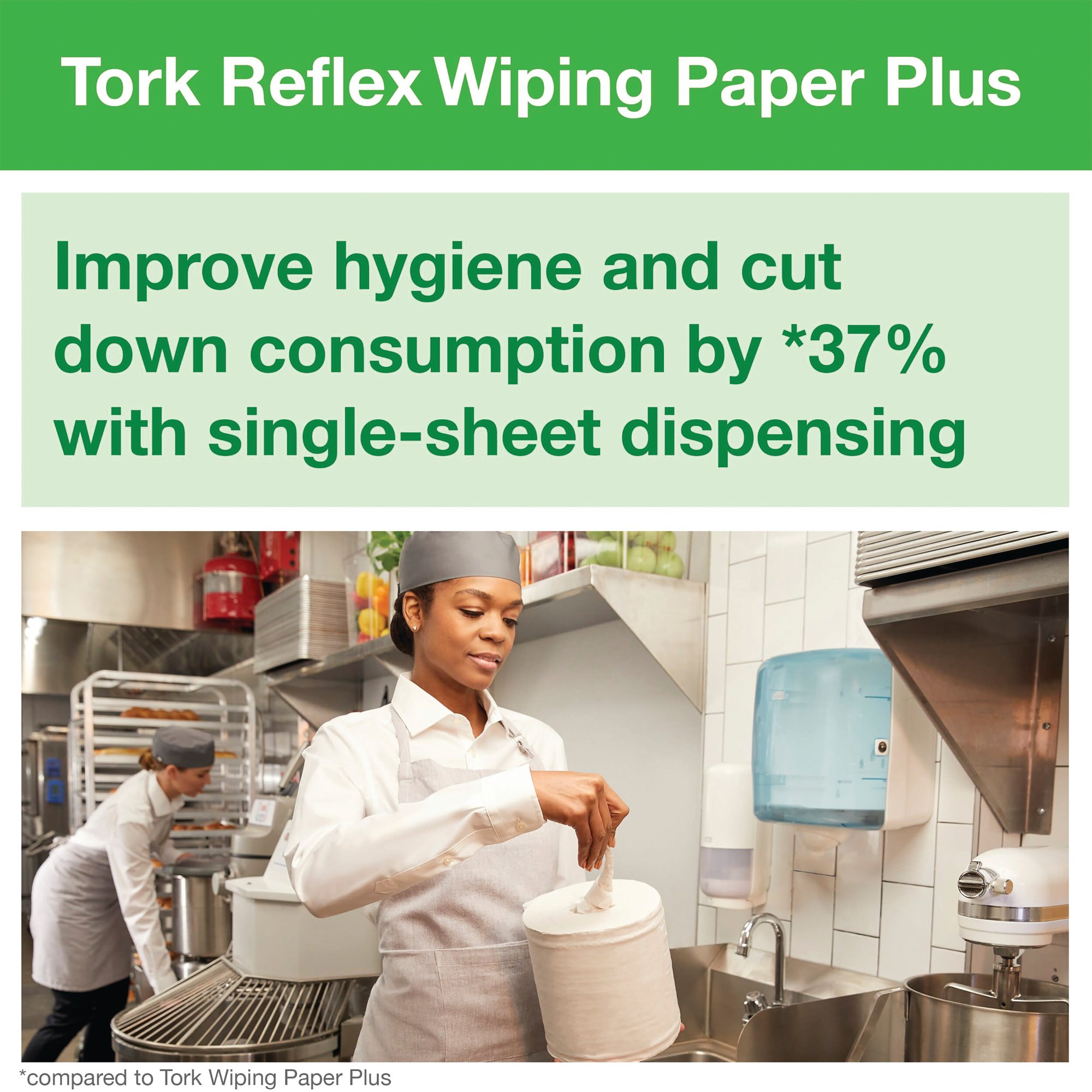 This two-ply Tork Reflex wiping paper plus is designed to take on any task that requires strength and absorbency whether it is quickly drying hands or mopping up liquids. For use with Tork's single sheet centrefeed dispenser systems to reduce consumption by 37%, saving money on industrial paper rolls. The absorbent, two-ply white paper comes on 150.2m rolls, with 429 sheets per roll. This pack contains 6 rolls.