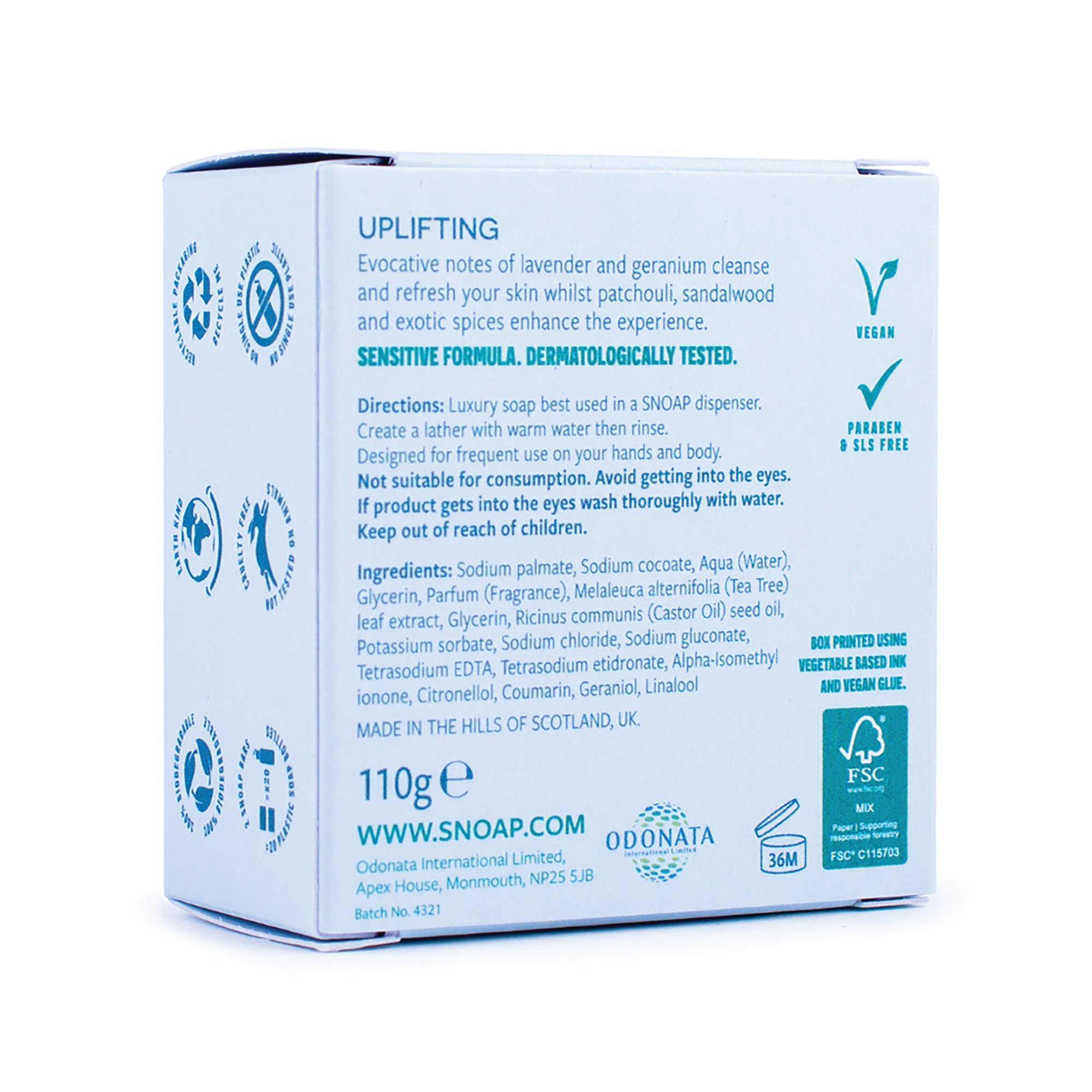 The Snoap refill for the Snoap dispensers is an environmentally friendly alternative to liquid soap. Free from plastic, the refill is in block soap form and packaged in a cardboard box. Featuring evocative notes of Lavender and Geranium, this Snoap will cleanse and refresh your skin whilst patchouli, sandalwood and exotic spices enhance the experience.