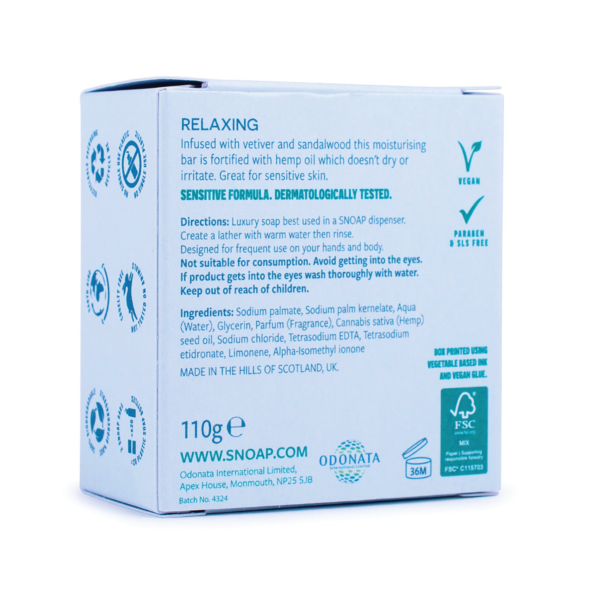 The Snoap refill for the Snoap dispensers is an environmentally friendly alternative to liquid soap. Free from plastic, the refill is in block soap form and packaged in a cardboard box. Infused with the earthy scents of Vetiver and Sandalwood, this moisturising bar is fortified with hemp oil which is ideal for sensitive skin, preventing dryness and irritation.