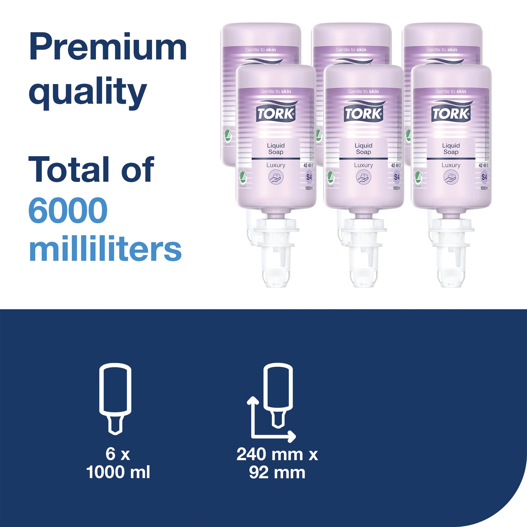 Tork Luxury Soft Liquid Soap S4: Provide visitors with an extra touch of luxury with Tork Luxury Liquid Soap. This luxurious jasmine-scented formulation is enriched with moisturising, lipid-replenishing ingredients for an indulgent and creamy hand washing experience. The soap is suitable for use with Tork S4 dispensers, which are certified easy to use and provide good hand hygiene to all users.