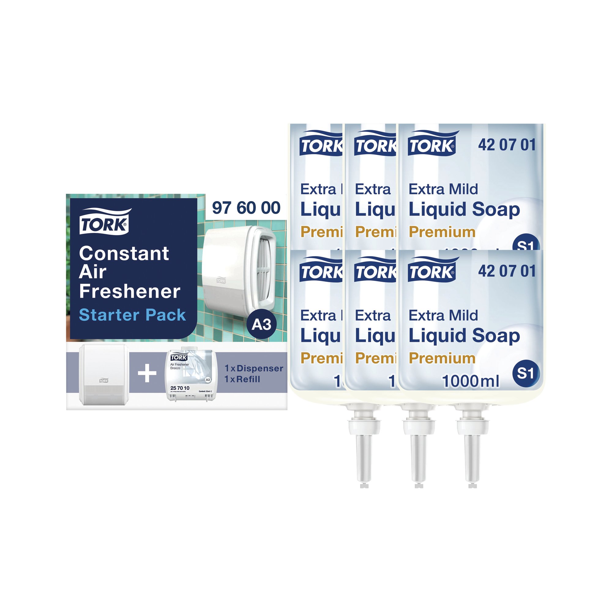 For use with Tork S1 liquid soap dispensing systems, this extra mild soap keeps skin soft while eliminating all dirt and grime with a perfume and colour free formulation. Gentle on the skin, the soap is certified by ECARF, the European Centre for Allergy Research Foundation. Designed to prevent the spread of microbes and bacteria, this soap helps to prevent contamination around the workplace. For use with Tork liquid soap dispensers, this refill boasts 1,000 shots per refill cartridge. This promotion includes a pack of 6 1 litre soap cartridges plus a free Tork Constant Air Freshener Starter Pack comprising of one dispenser and one Breeze refill.
