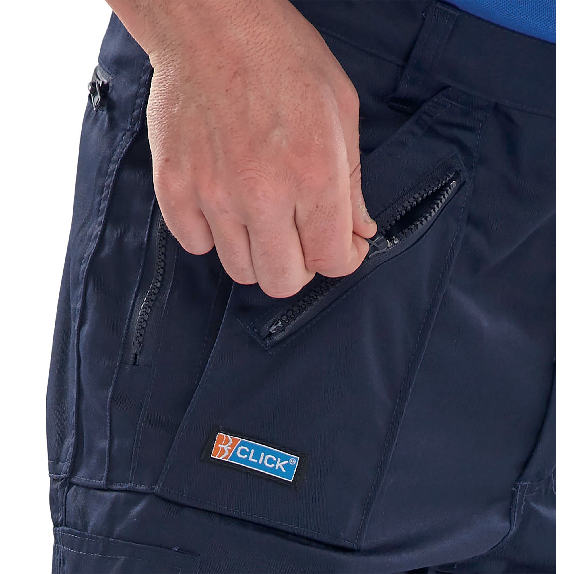 Beeswift Click Action Work Trousers are polycotton work trousers with a zip fly and 7 zipped multi sized pockets. Features double seat and knee patches. Machine washable at 40 degrees C.