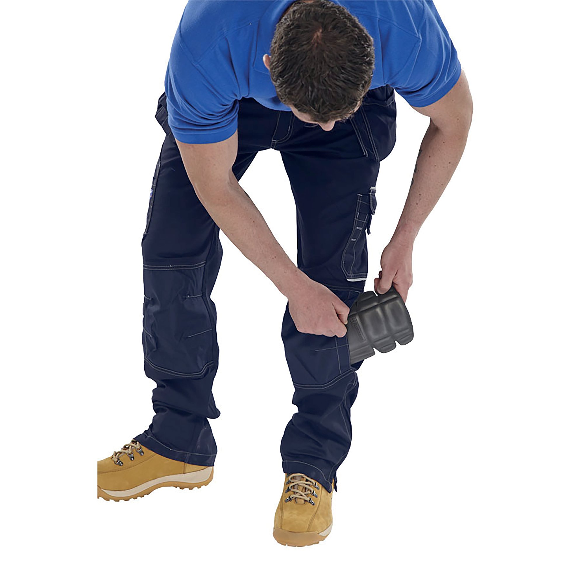 Multipurpose trousers made from 250gsm polycotton twill fabric. Features multiple pockets for storing tools to enable the wearer to remain hands free, reinforced knees and side elastic on waist for all day comfort. External nee pad pockets allow for insertion of knee pads for kneeling comfort. Machine washable at 40 degrees C.