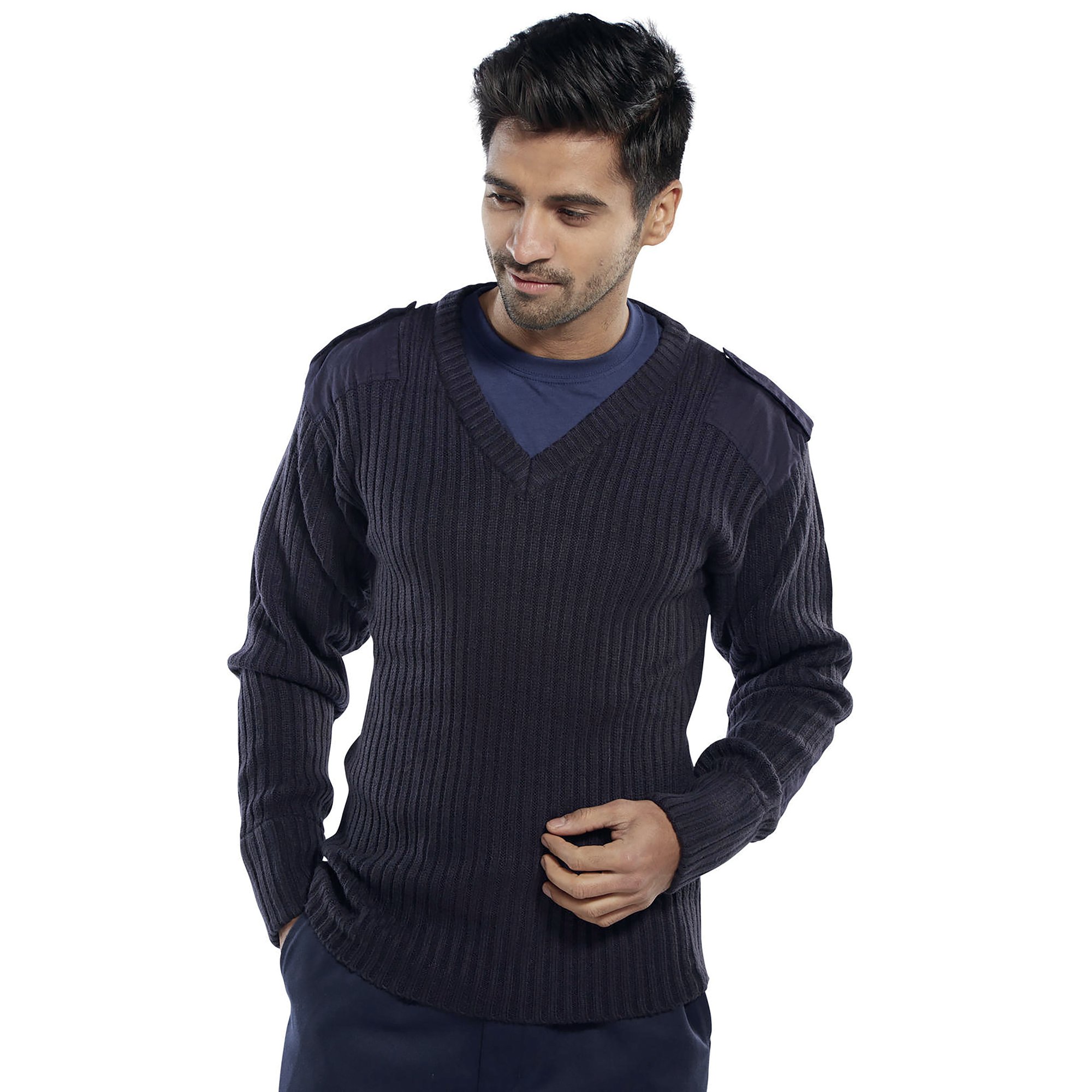 Military style security sweater made from 100% rib knit acrylic. Military style features shoulder and elbow patches and epaulettes on shoulder. Made from thick material for added warmth.