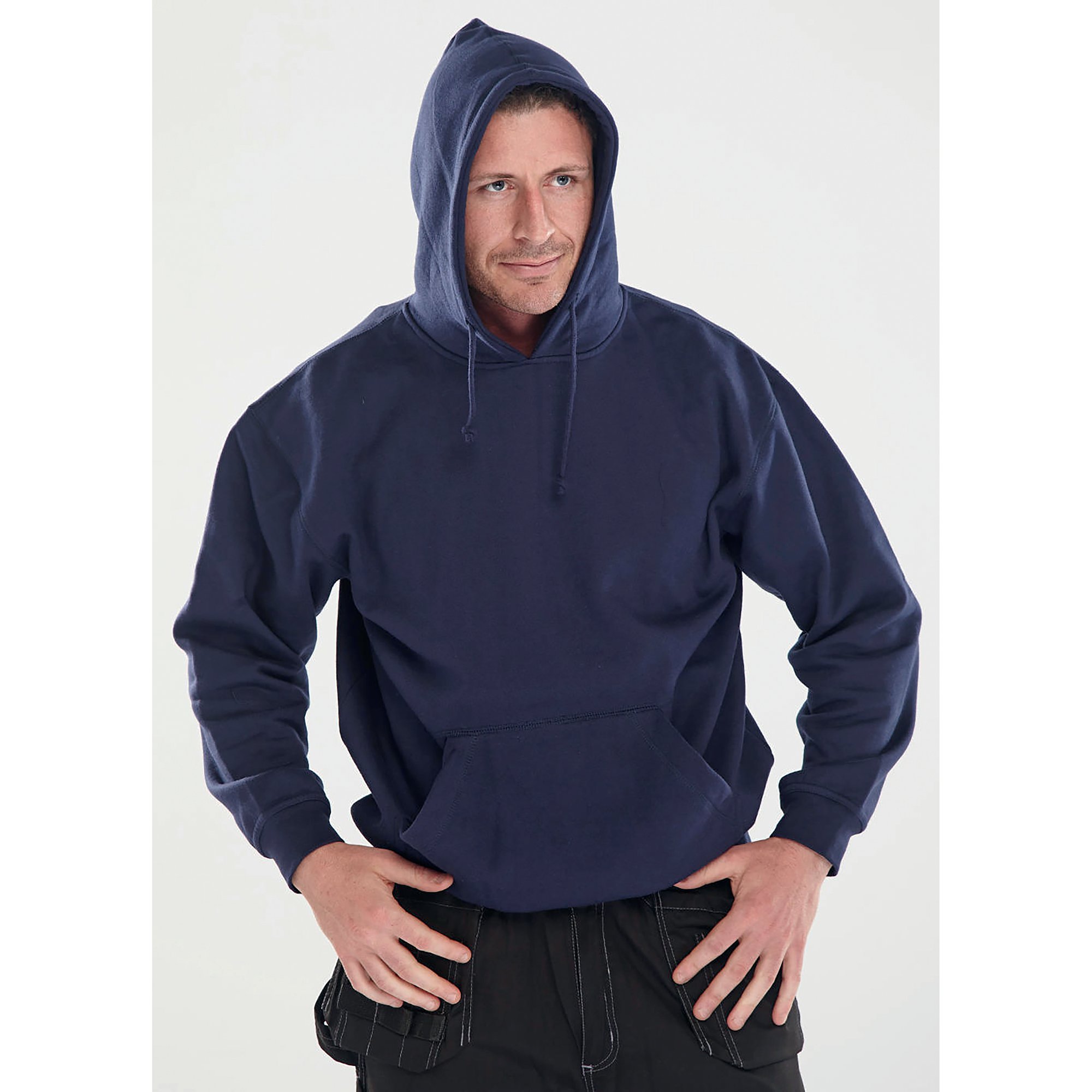 This hooded sweatshirt is made from 65% polyester and 35% polycotton fleece inner for warmth. The front pouch pocket contains a hidden mobile phone pocket to keep your phone secure. Ribbed cuffs and waistband keep the draughts out. Machine washable at 40 degrees C.