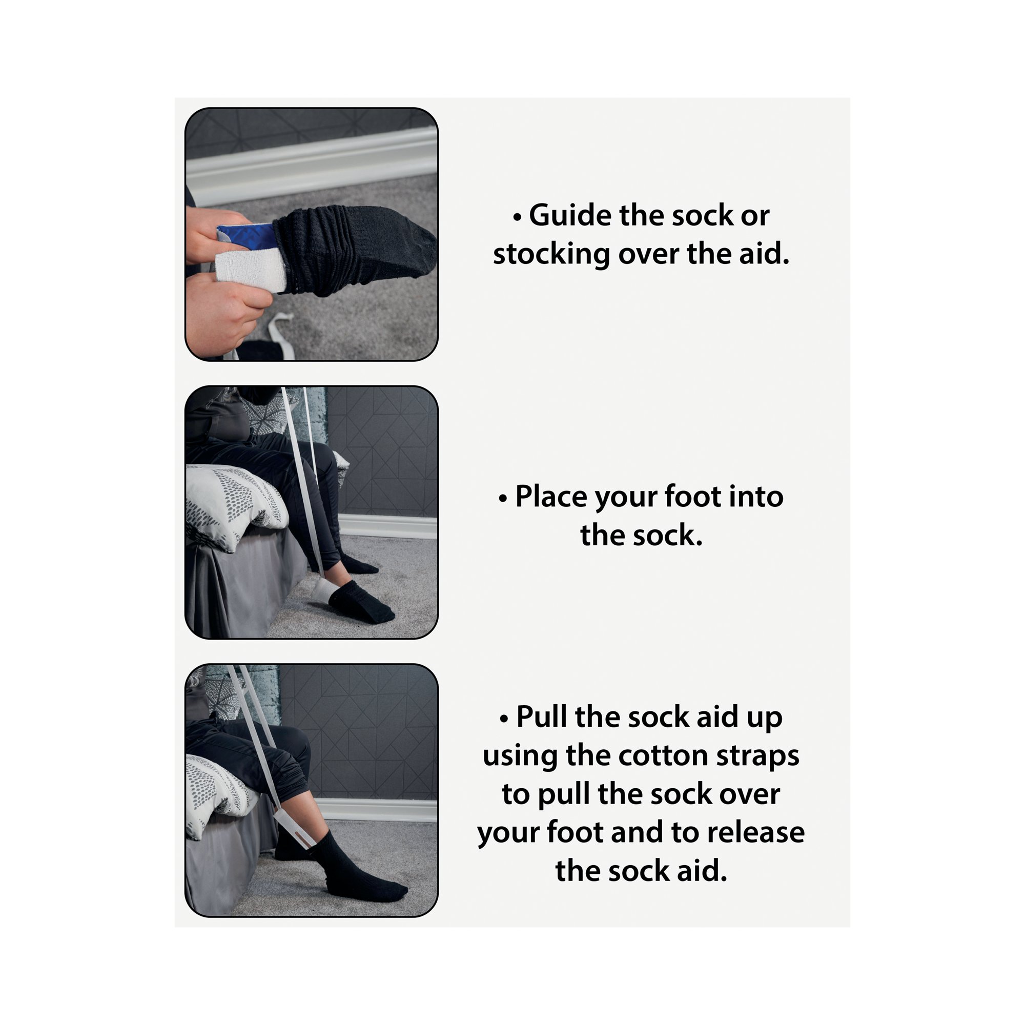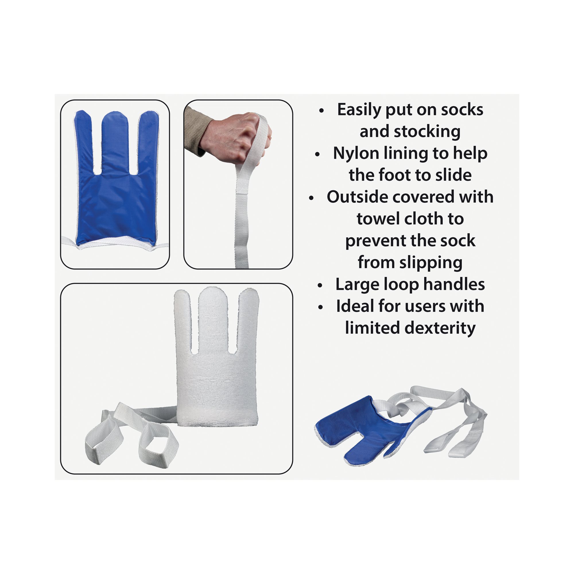 The Sock and Stocking Dressing Aid makes putting on socks and stockings easy. Large loop handles at the end of strong 32-inch straps make this a popular dressing aid for arthritis sufferers. The nylon lining of the sock and stocking aid helps the foot to slide easily through the garment.
